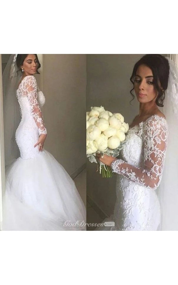 Gorgeous Off-shoulder V Neck Lace Mermaid Gown With Long Sleeves