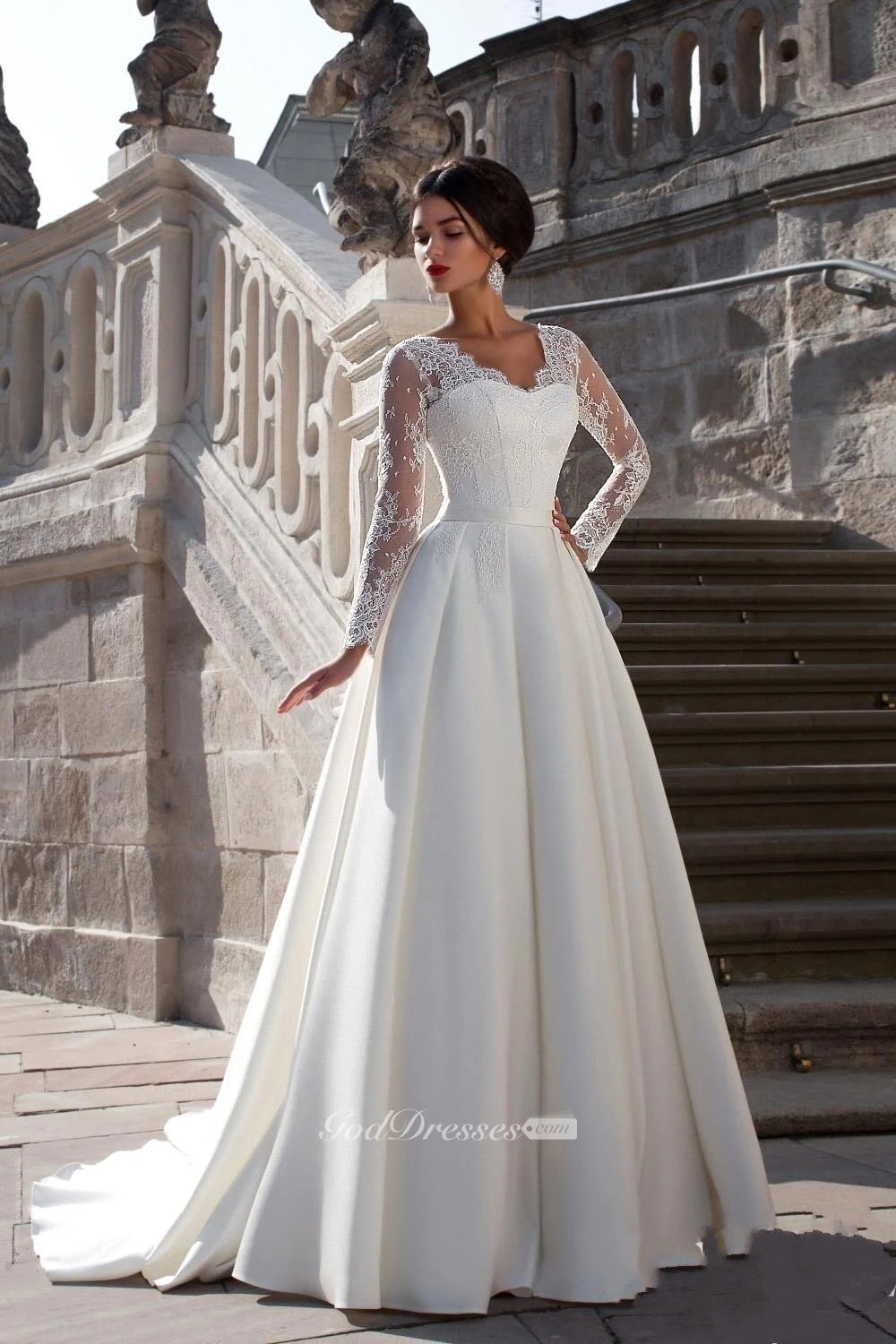 Gorgeous Scalloped Neck Satin A-line Gown With Lace Sleeves