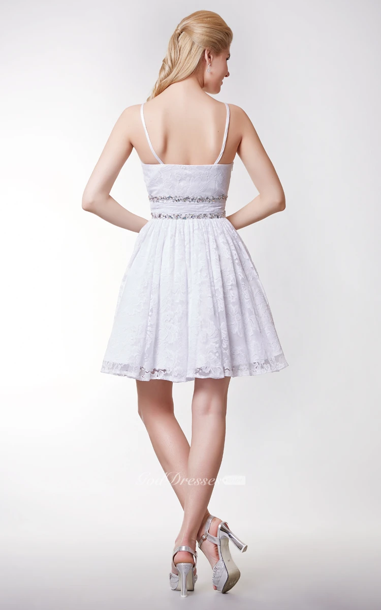 Make the most unforgettable first impression at your prom in this elegant above-the-knee, a short dress made with the comfortable lacy material, that will keep you on the dance floor all night! With a stunning waistline, studded with gorgeous embellishments, to add some extra spark to your night! The spaghetti straps are removable if you so desire to go strapless!