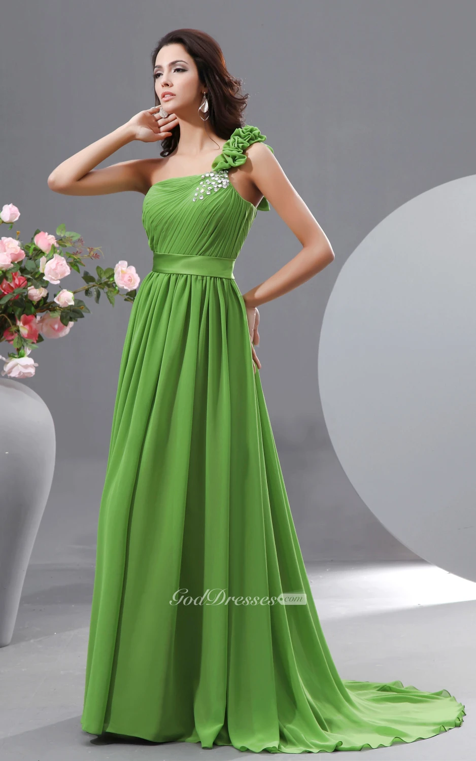 Graceful Floral One-Shoulder Chiffon A-Line Gown Has Crystal Details