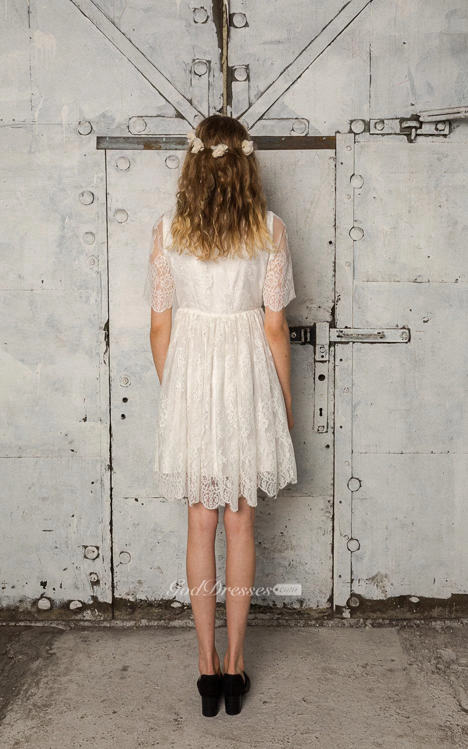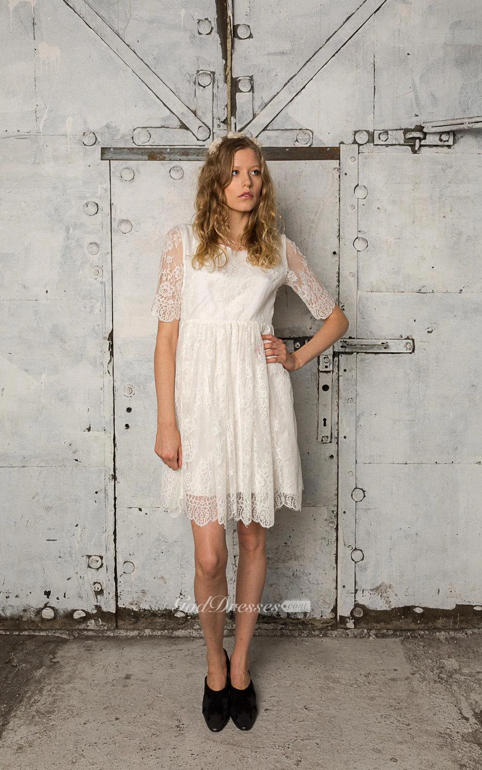 Half Sleeve A-Line Bateau Neck Lace Dress With Asymmetrical Hemline