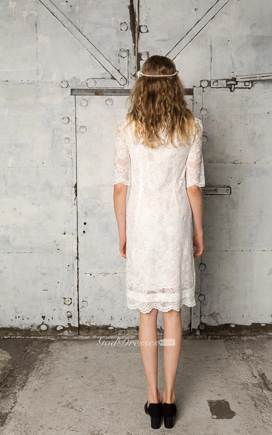 Half Sleeve Knee Length Lace Dress With Bateau Neckline