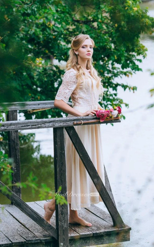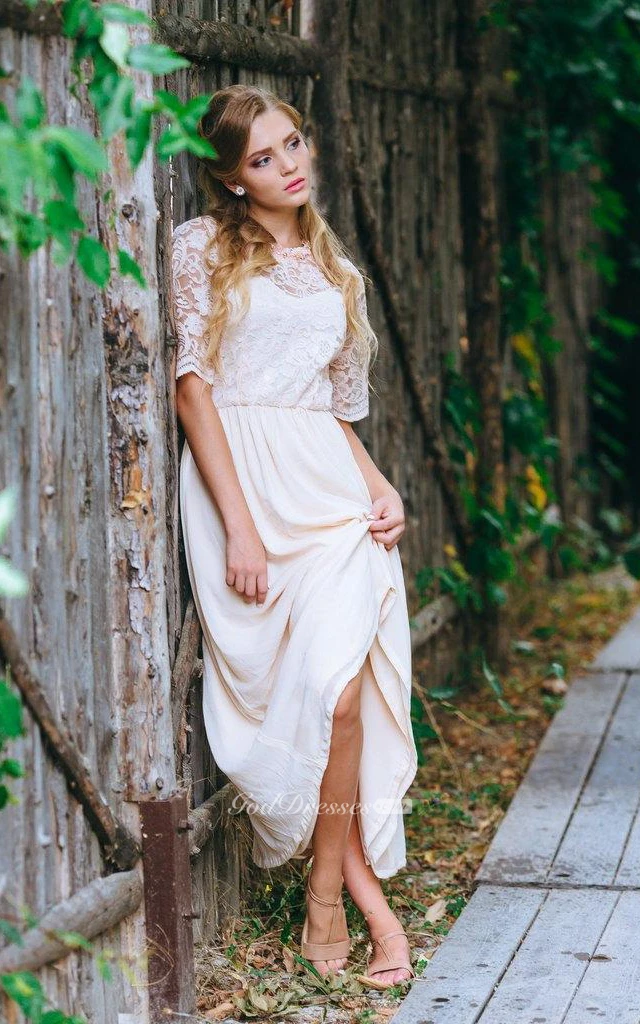 Half Sleeve Lace and Chiffon A-Line Dress With Jewel Neckline