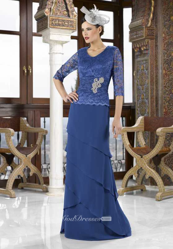 Half Sleeve Lace V-Neck Chiffon Mother Of The Bride Dress With Tiers