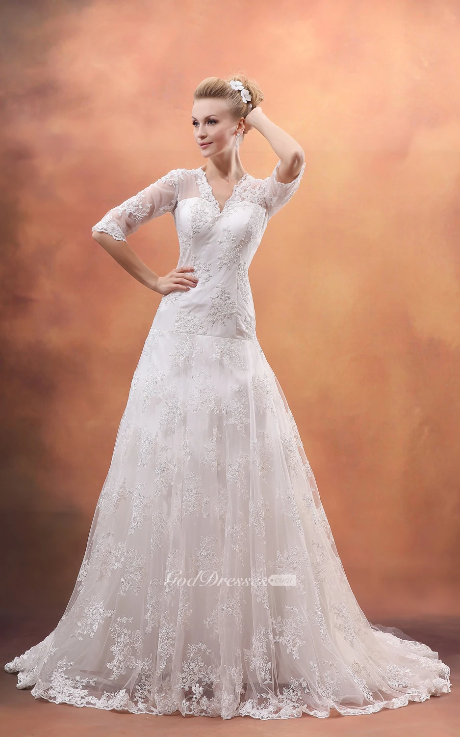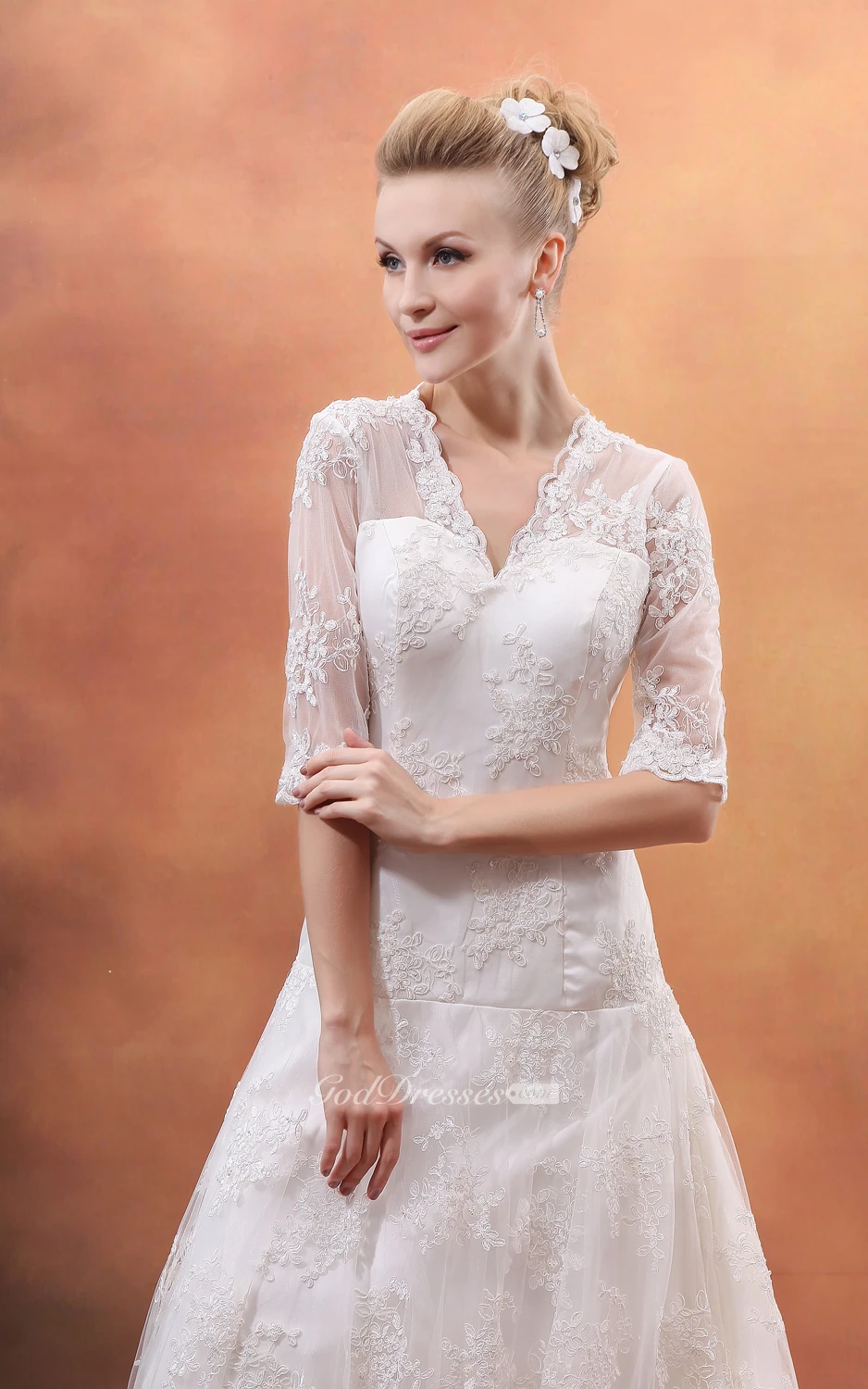Half-Sleeve V-Neck Dress With Lace Appliques and Tulle Overlay