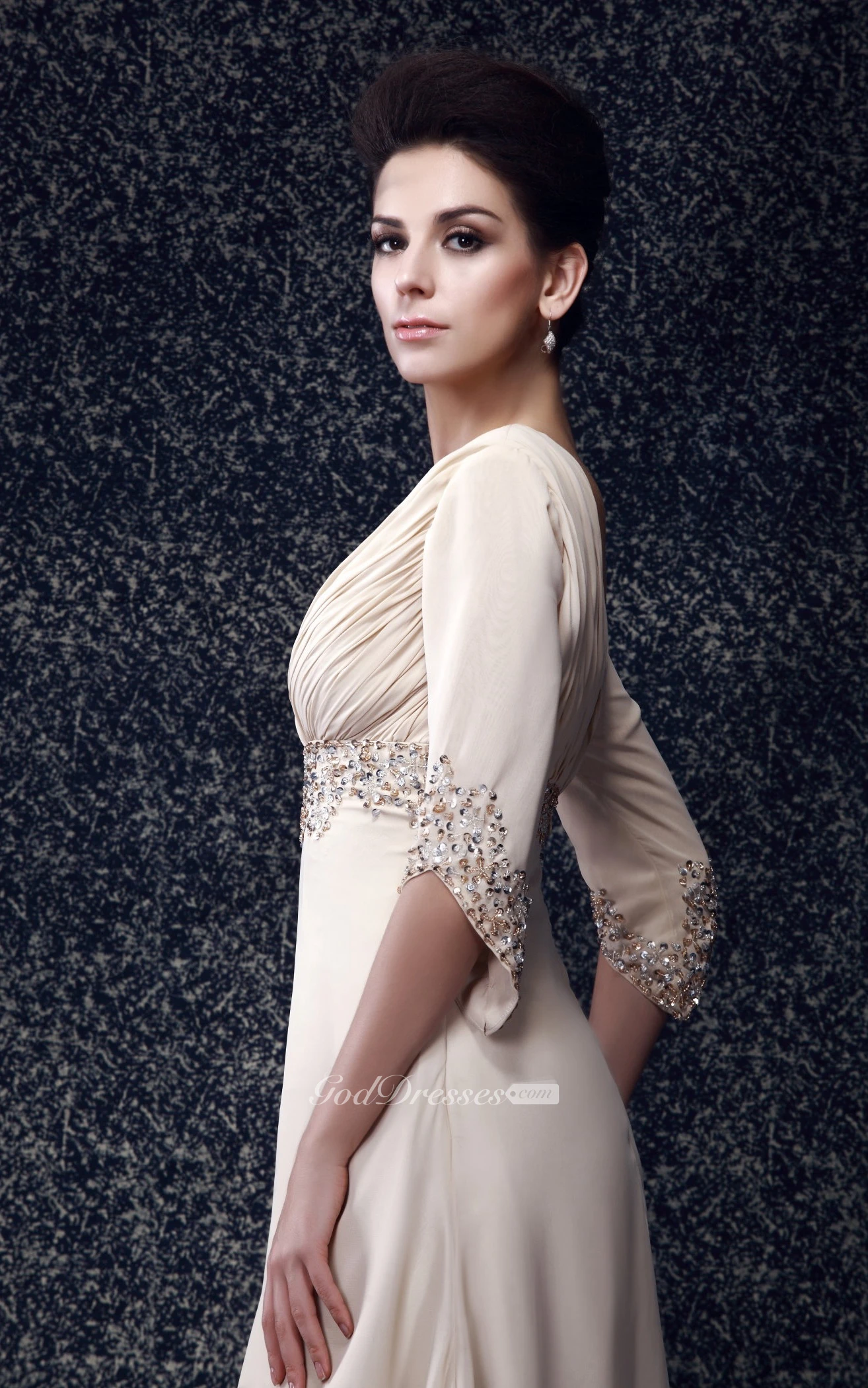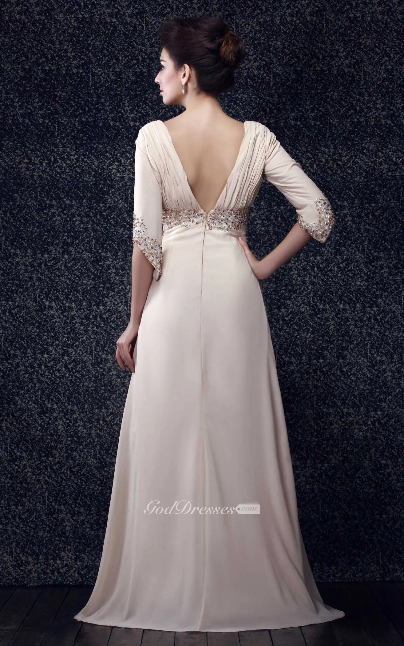 Half-Sleeve V-Neck Floor-Length Dress With Beaded Waist