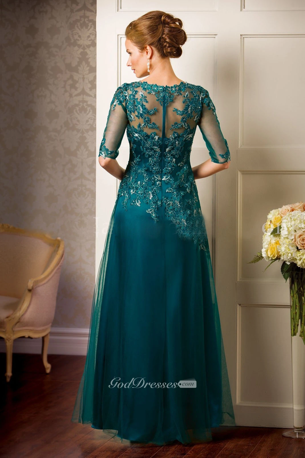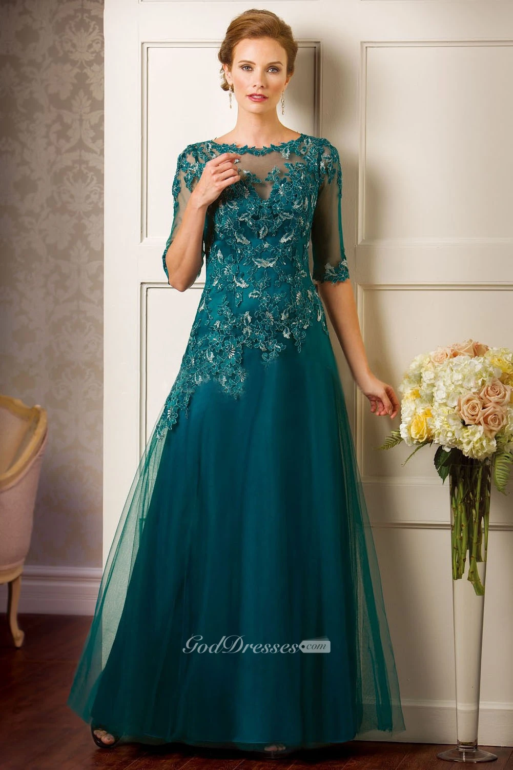 Half-Sleeved A-Line Tulle Gown With Appliques