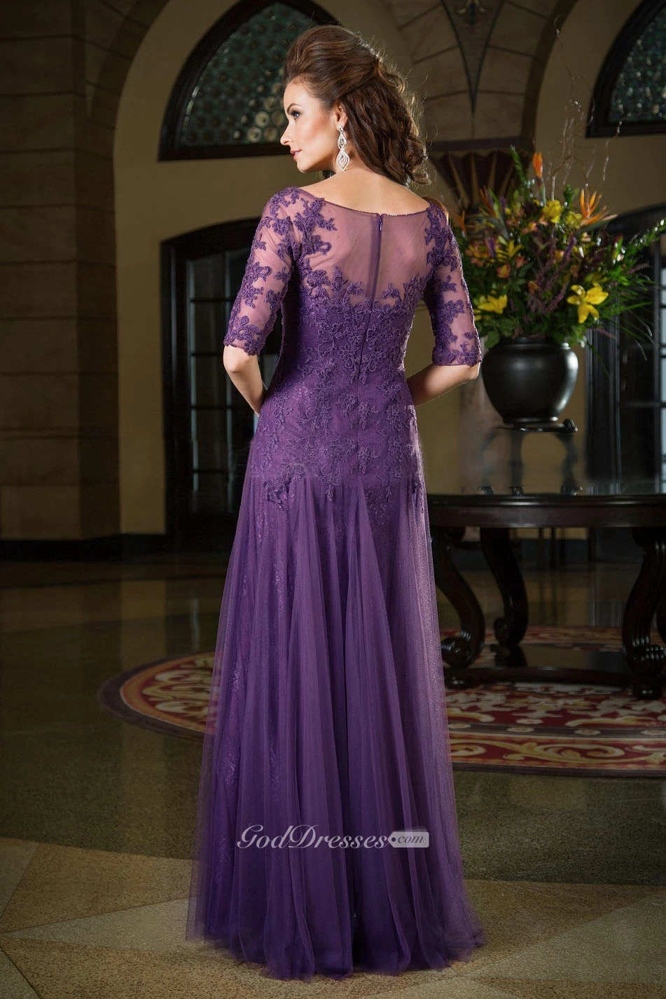 Half-Sleeved Long Mother Of The Bride Dress With Dropped Waistline And Appliques