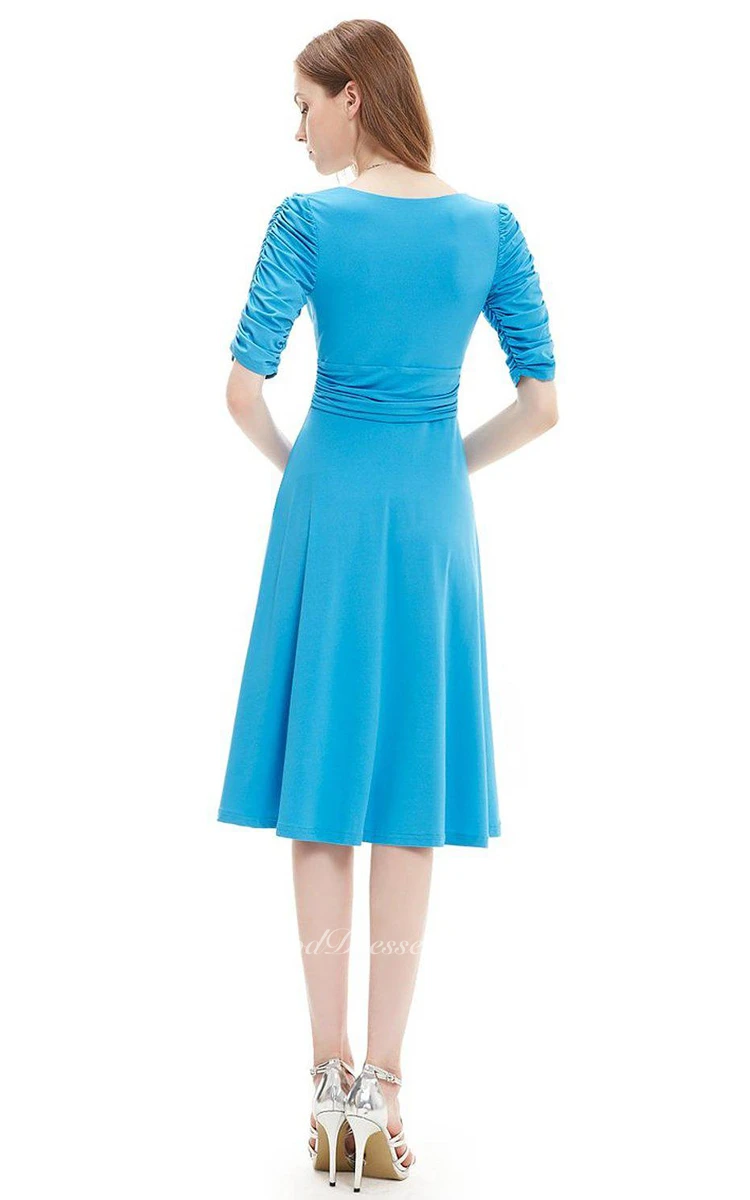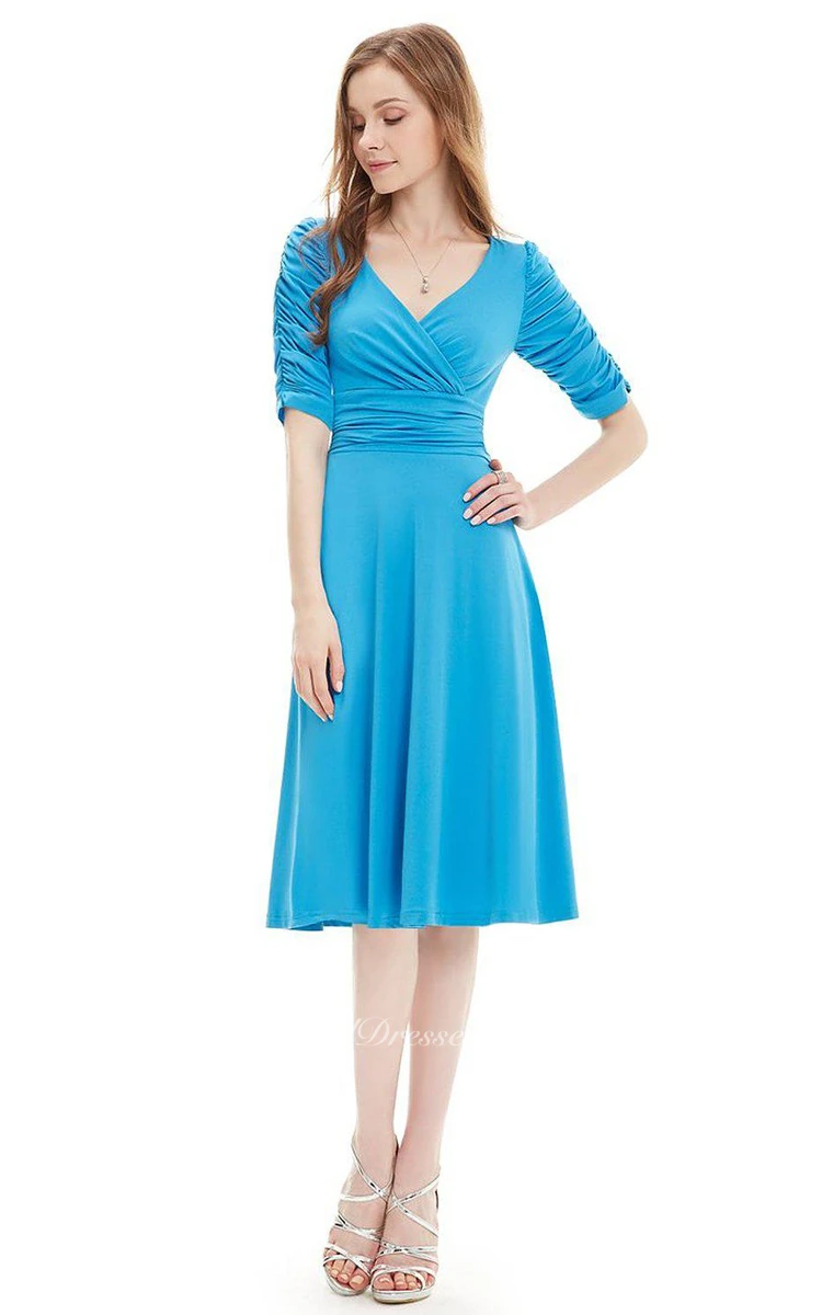 Half-sleeved V-neck Knee-length Ruched Dress