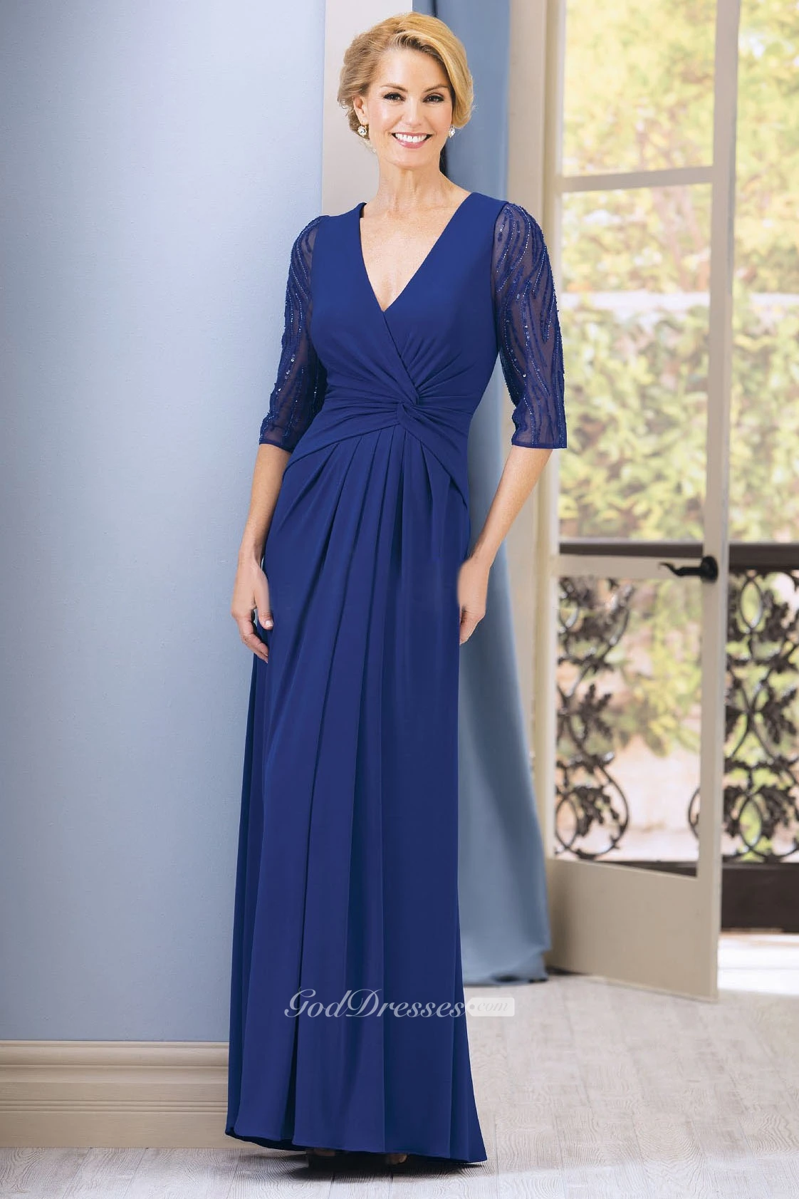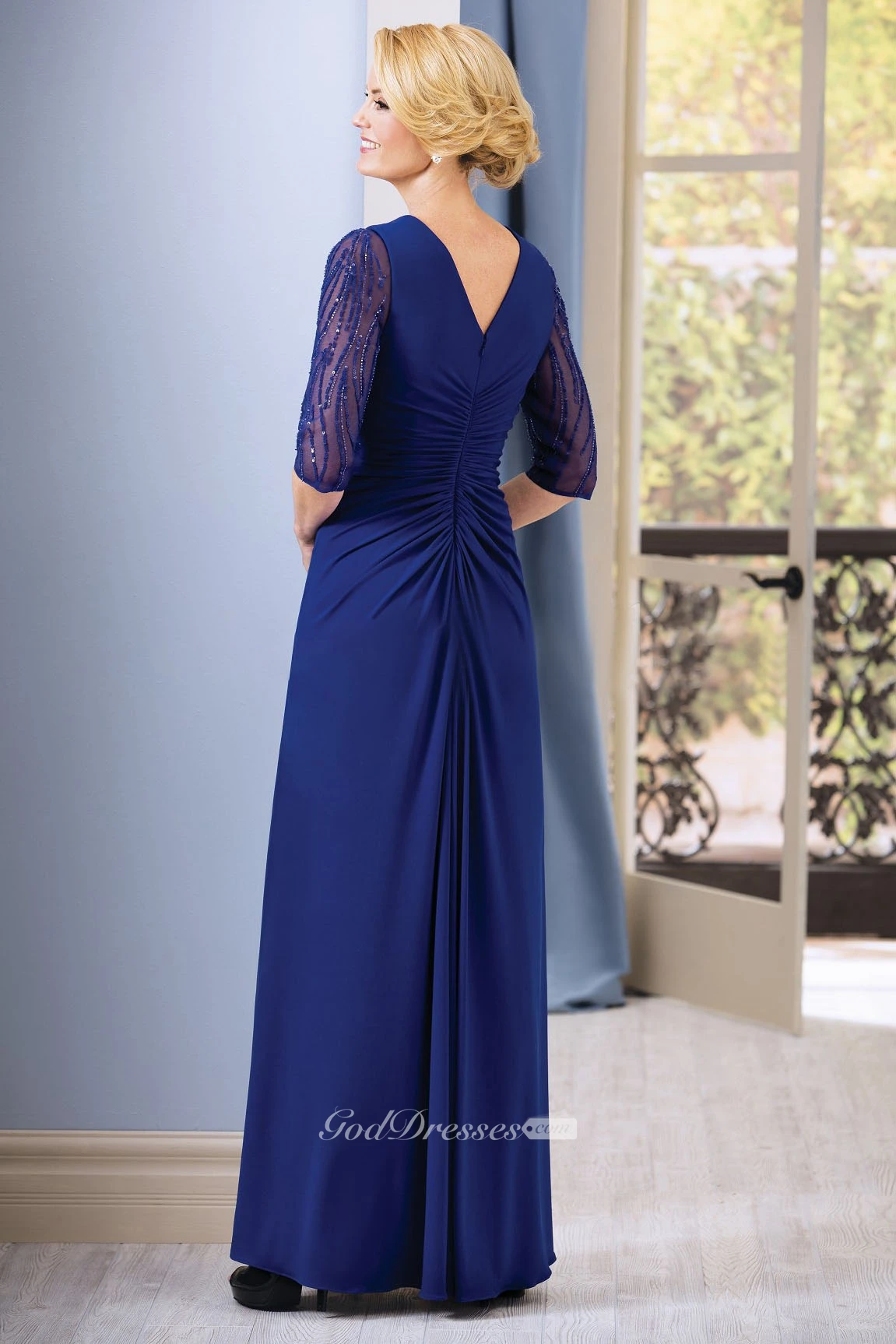 Half-Sleeved V-Neck Long Gown With Beadings And Pleats