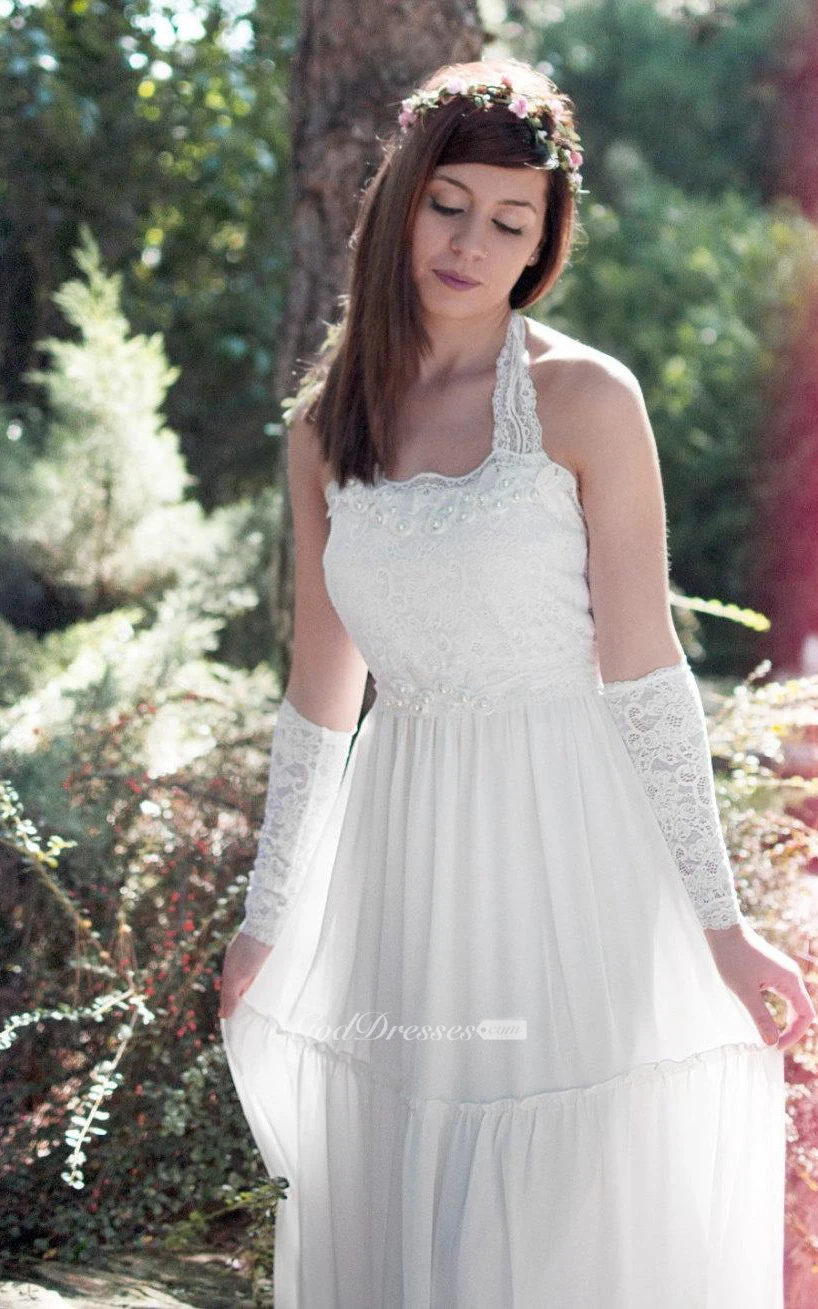 Halter Backless Long Jersey Wedding Dress With Beadings And Lace