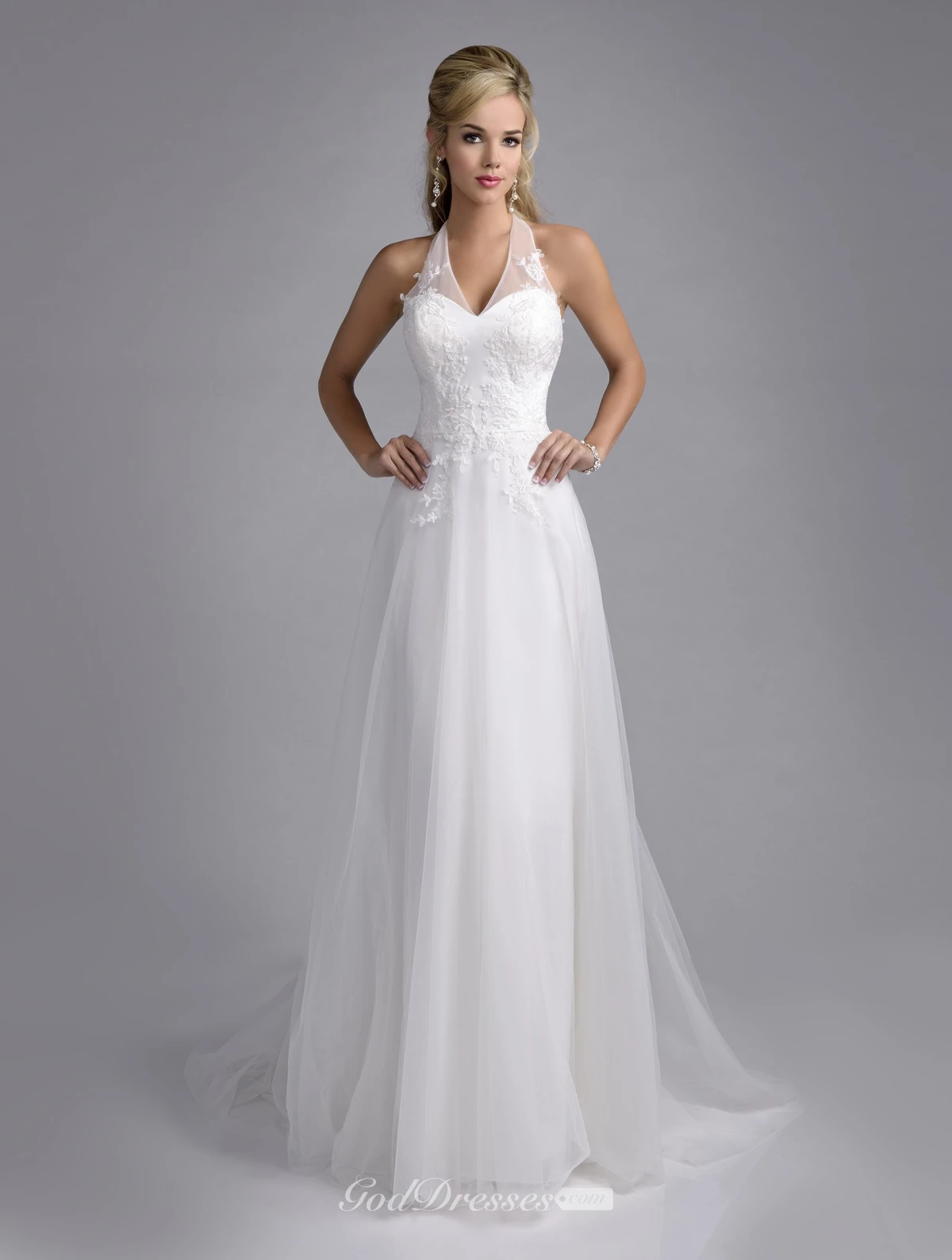 Halter Tulle A-Line Bridal Wedding Dress With Lace Appliques