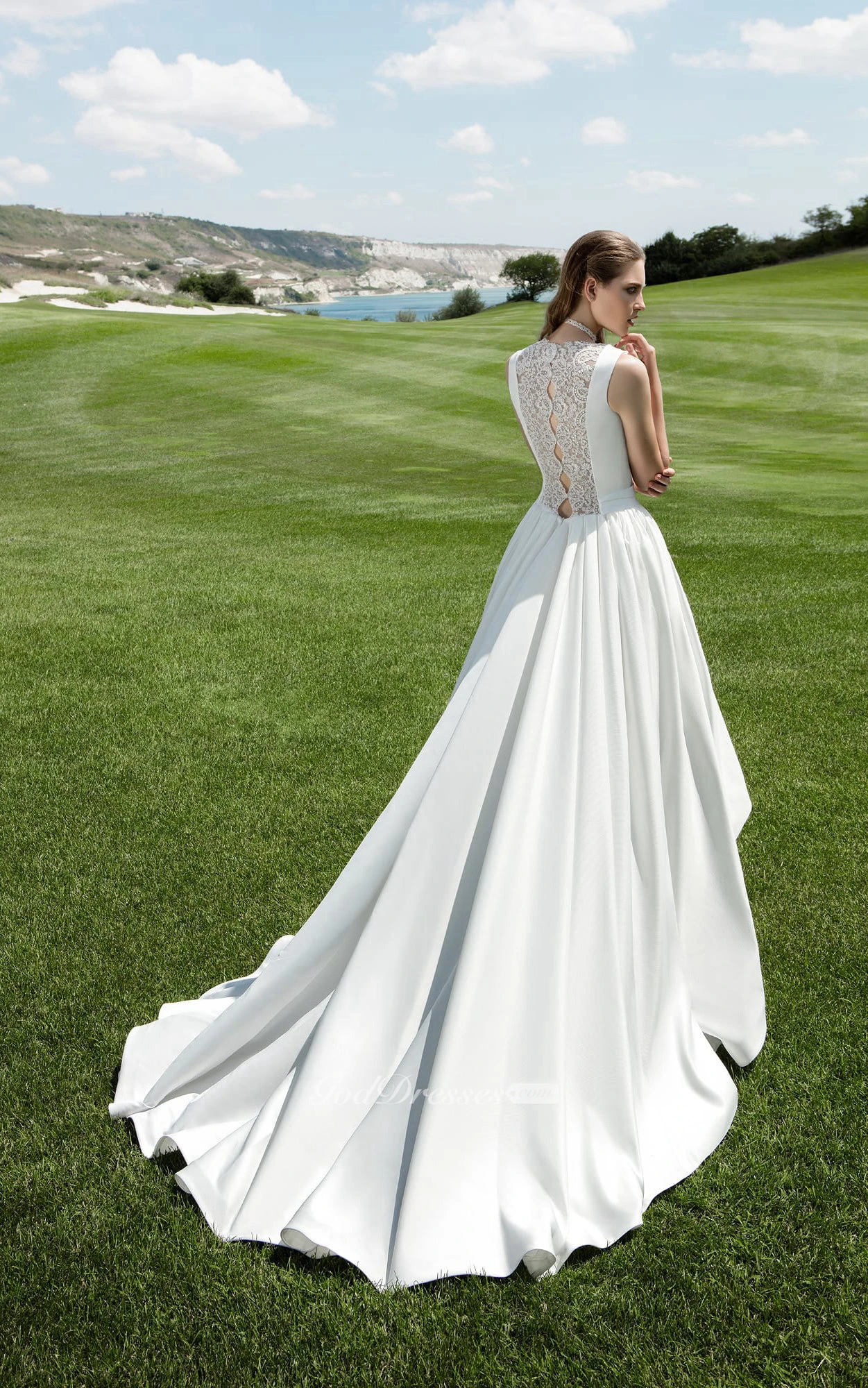 High-low Bateau Sleeveless Illusion Back Satin Dress With Bow