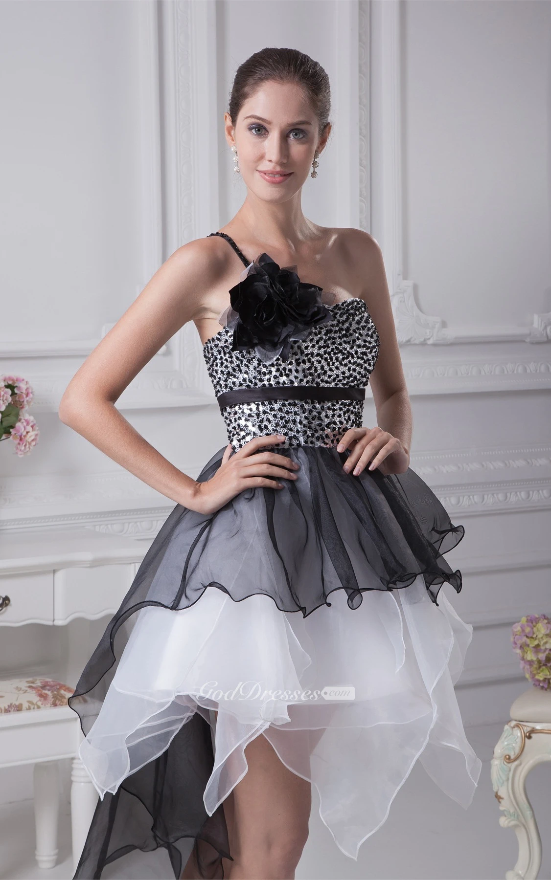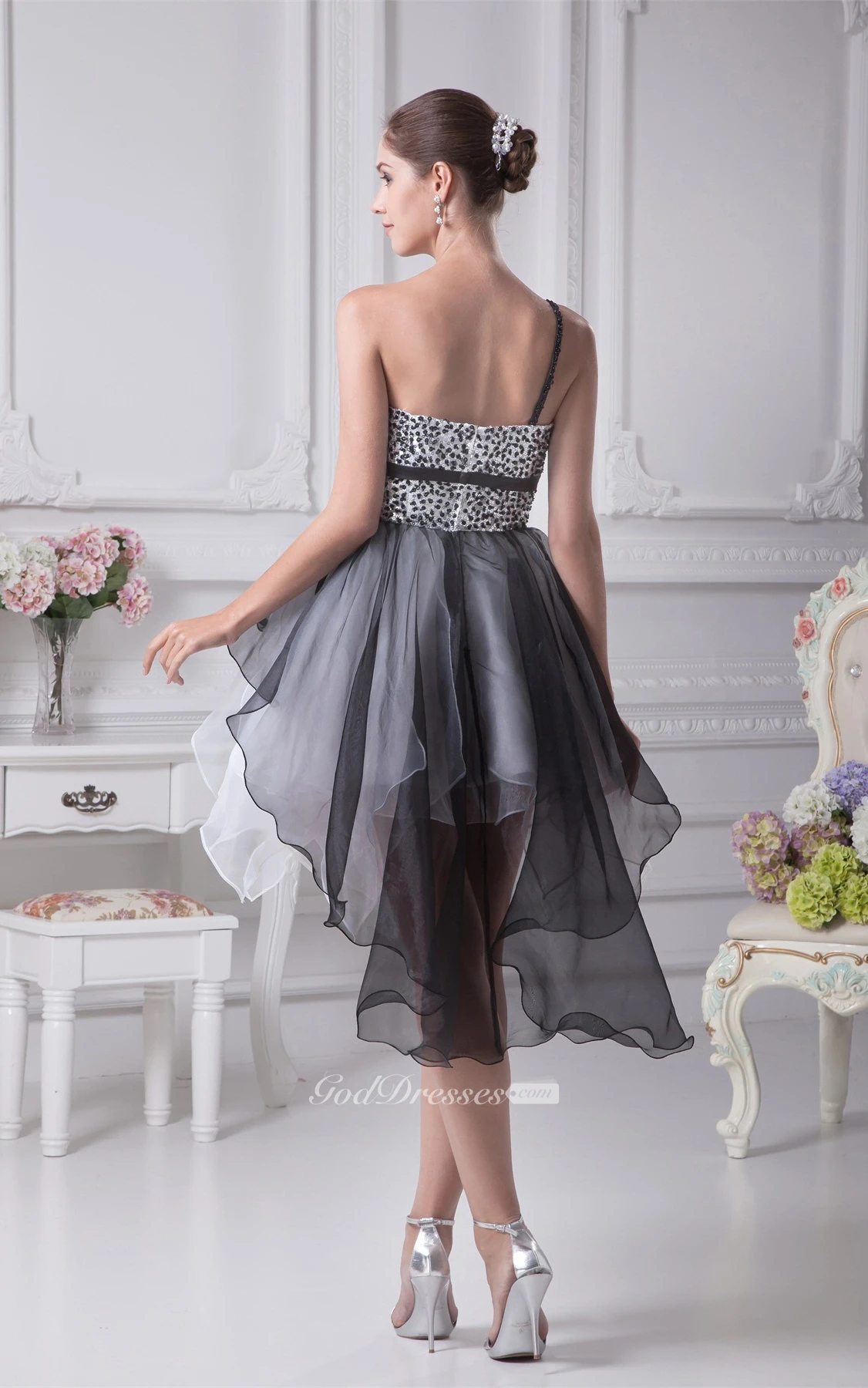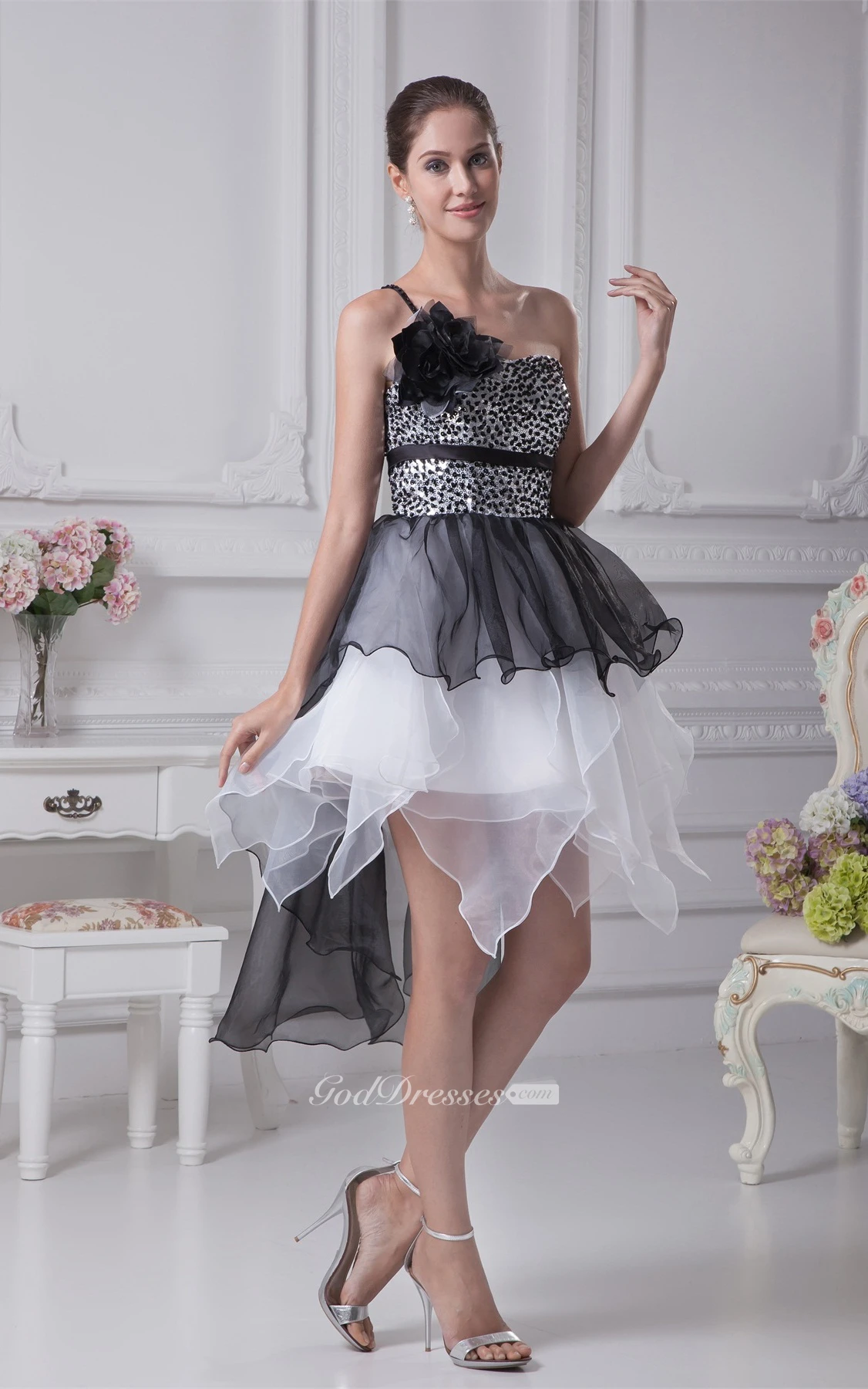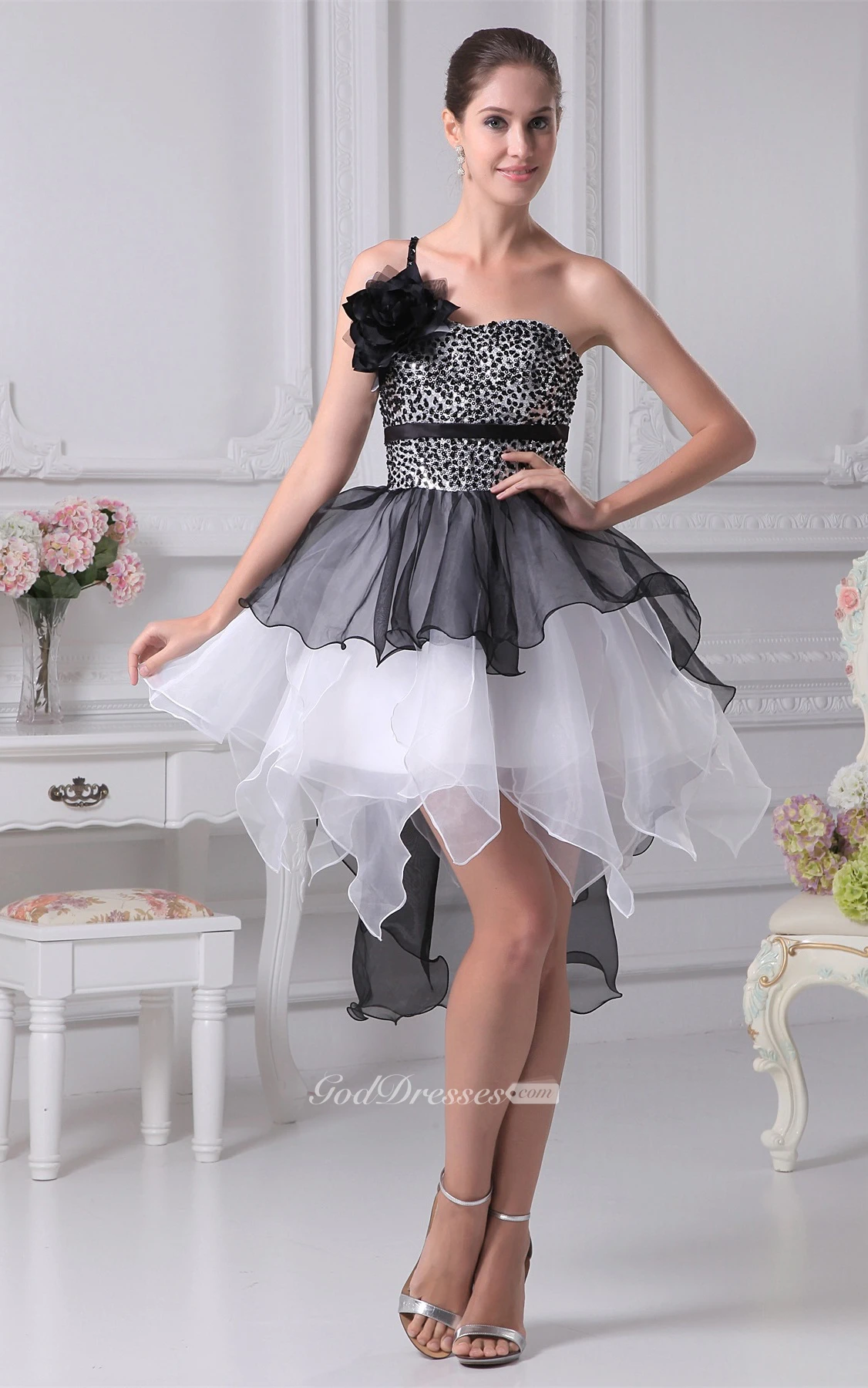 High Low Flowered One Shoulder Jeweled Bodice Gown With Layered Ruffles