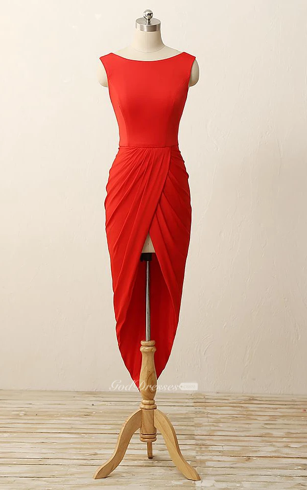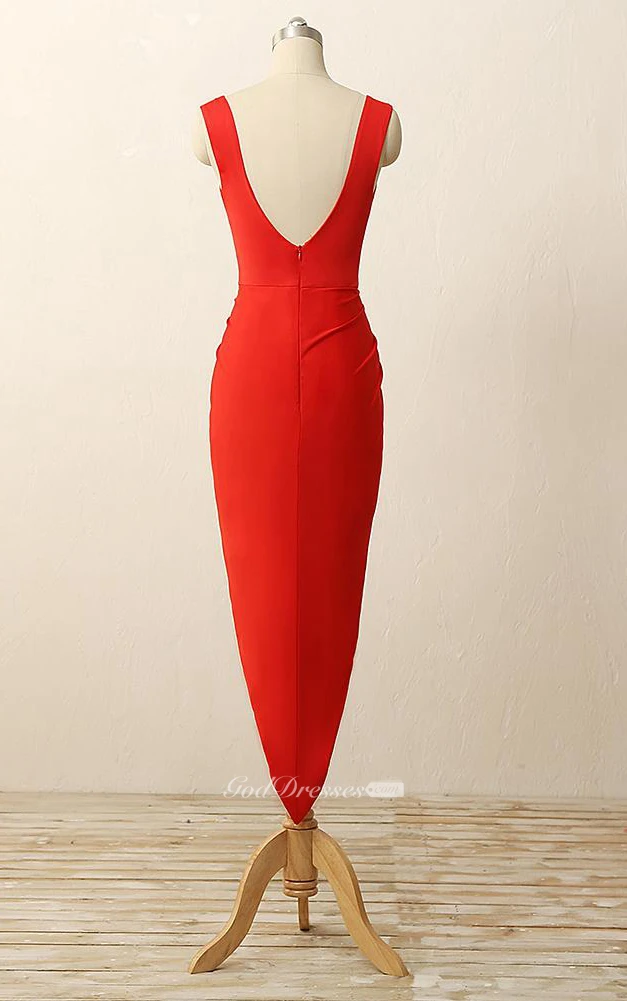 High-low Pleats Zipper Low-v Back Sheath Chiffon Dress
