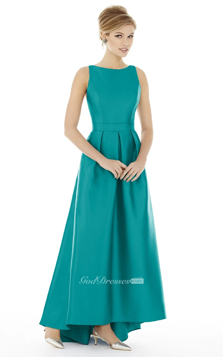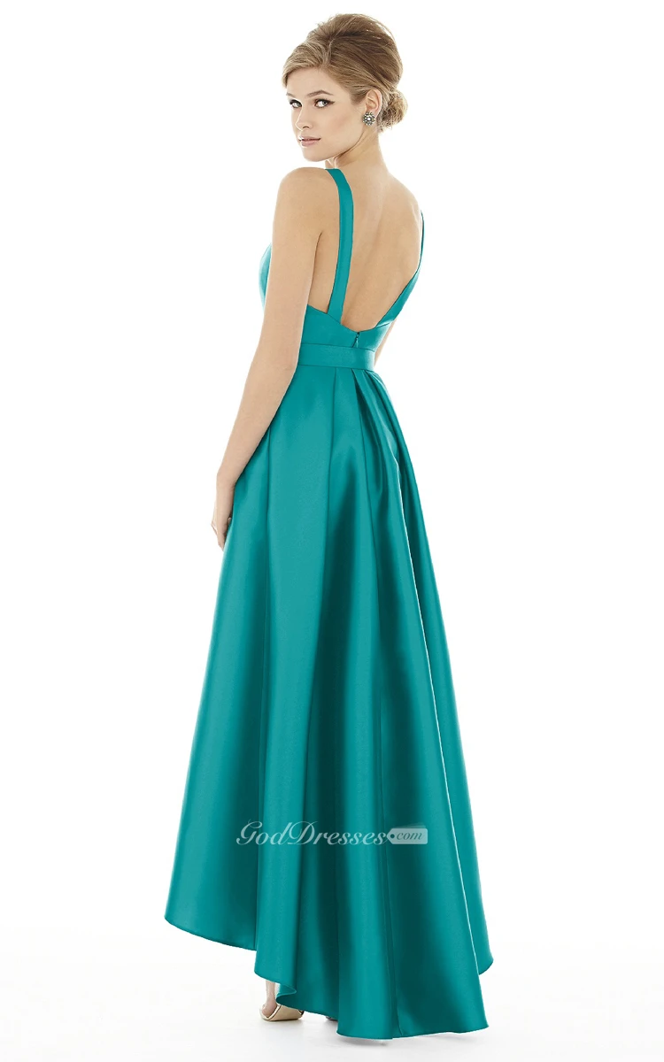High-Low Sleeveless Jewel Satin Dress with Strap-Back