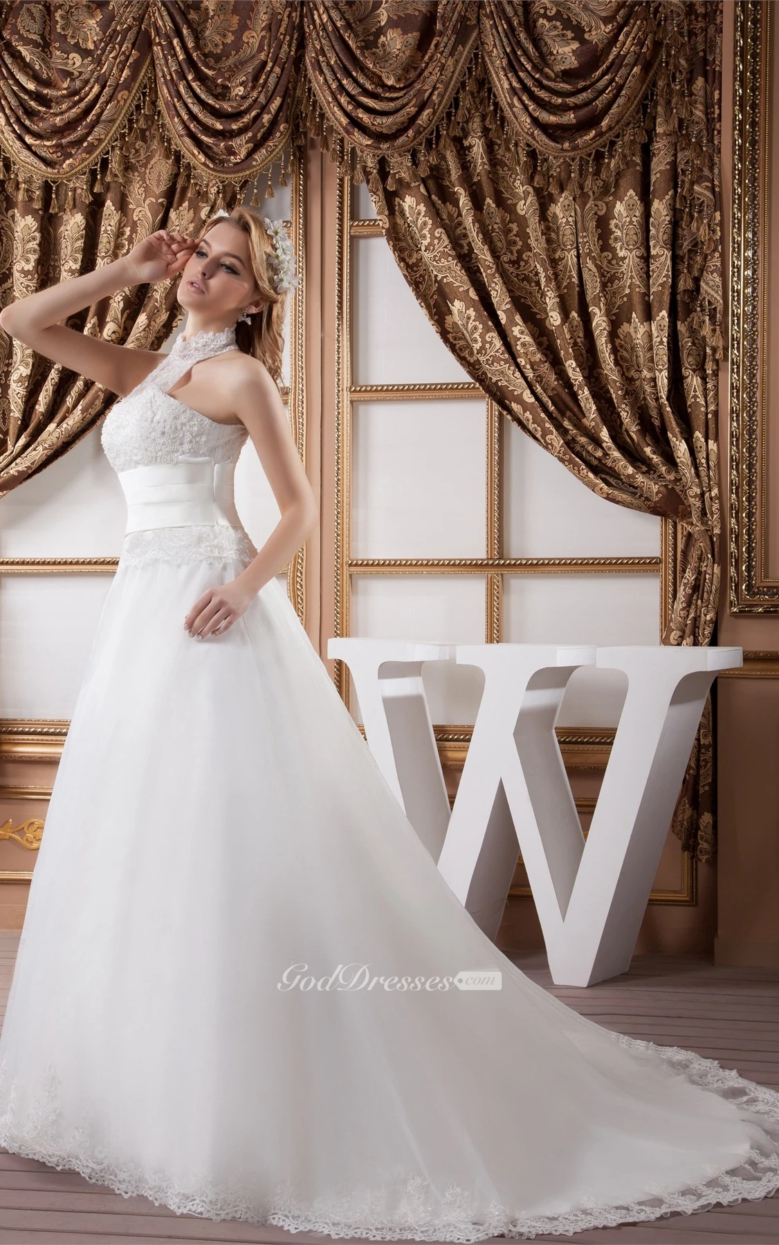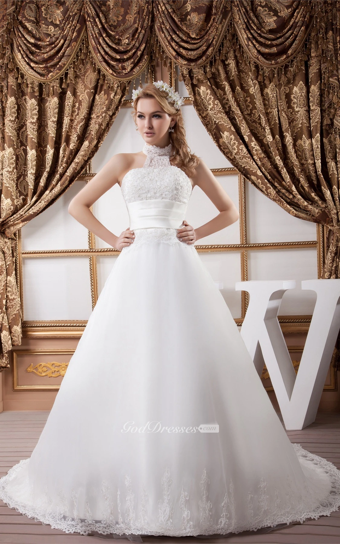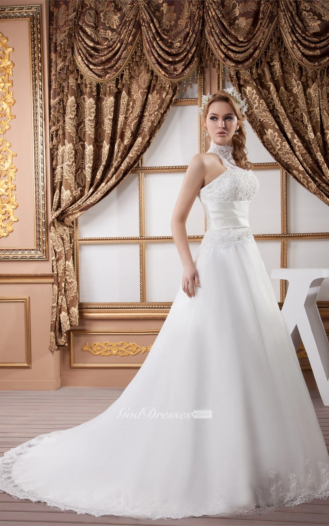High-Neck A-Line Sleeveless Fitted Waist and Dress With Lace