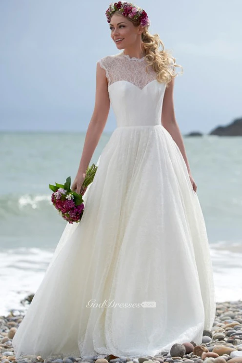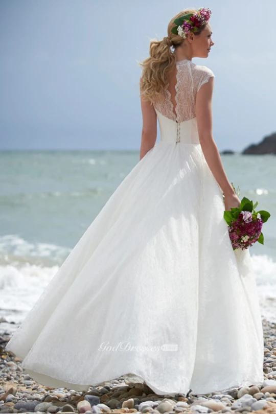High Neck Floor-Length Lace Wedding Dress With Illusion