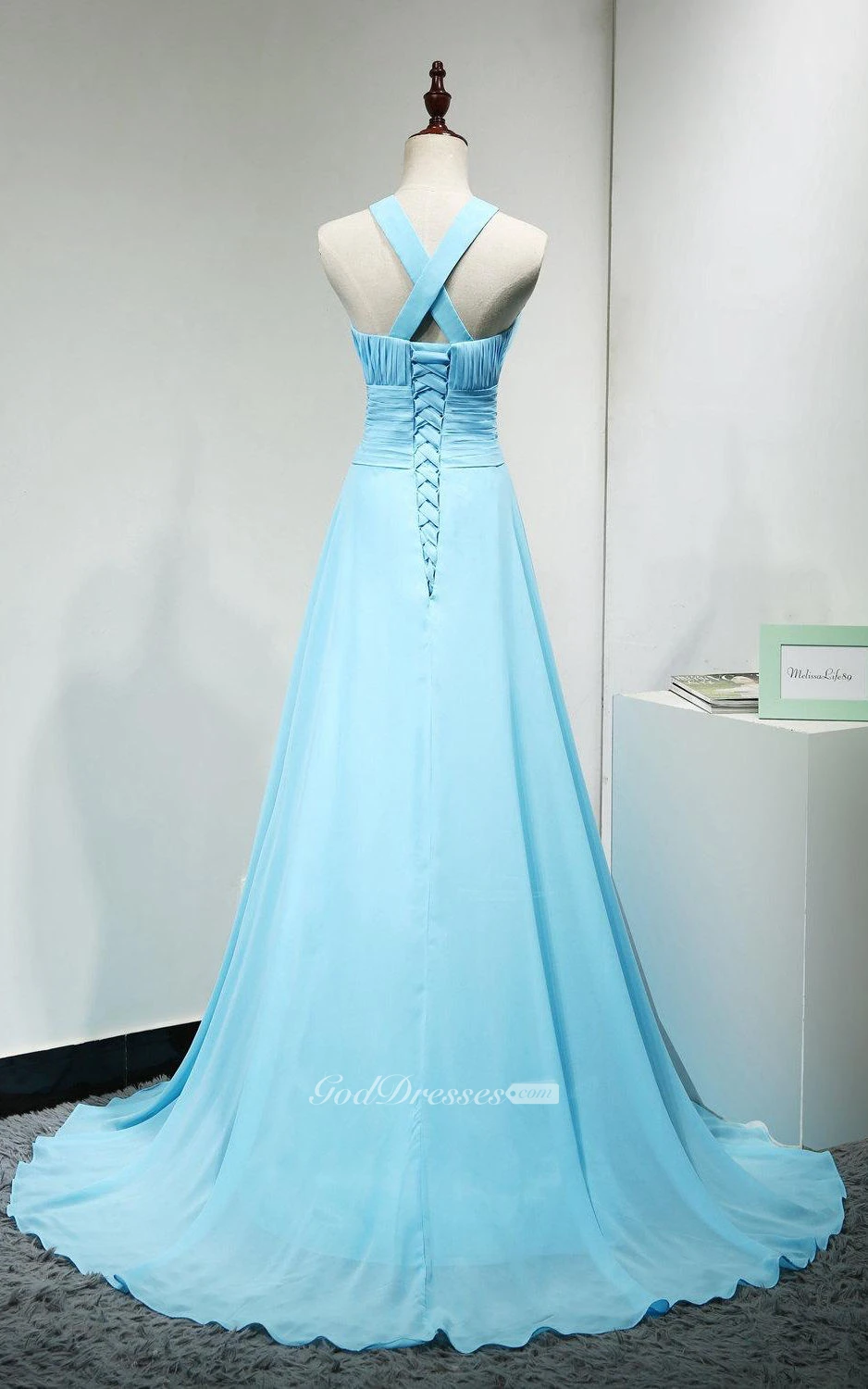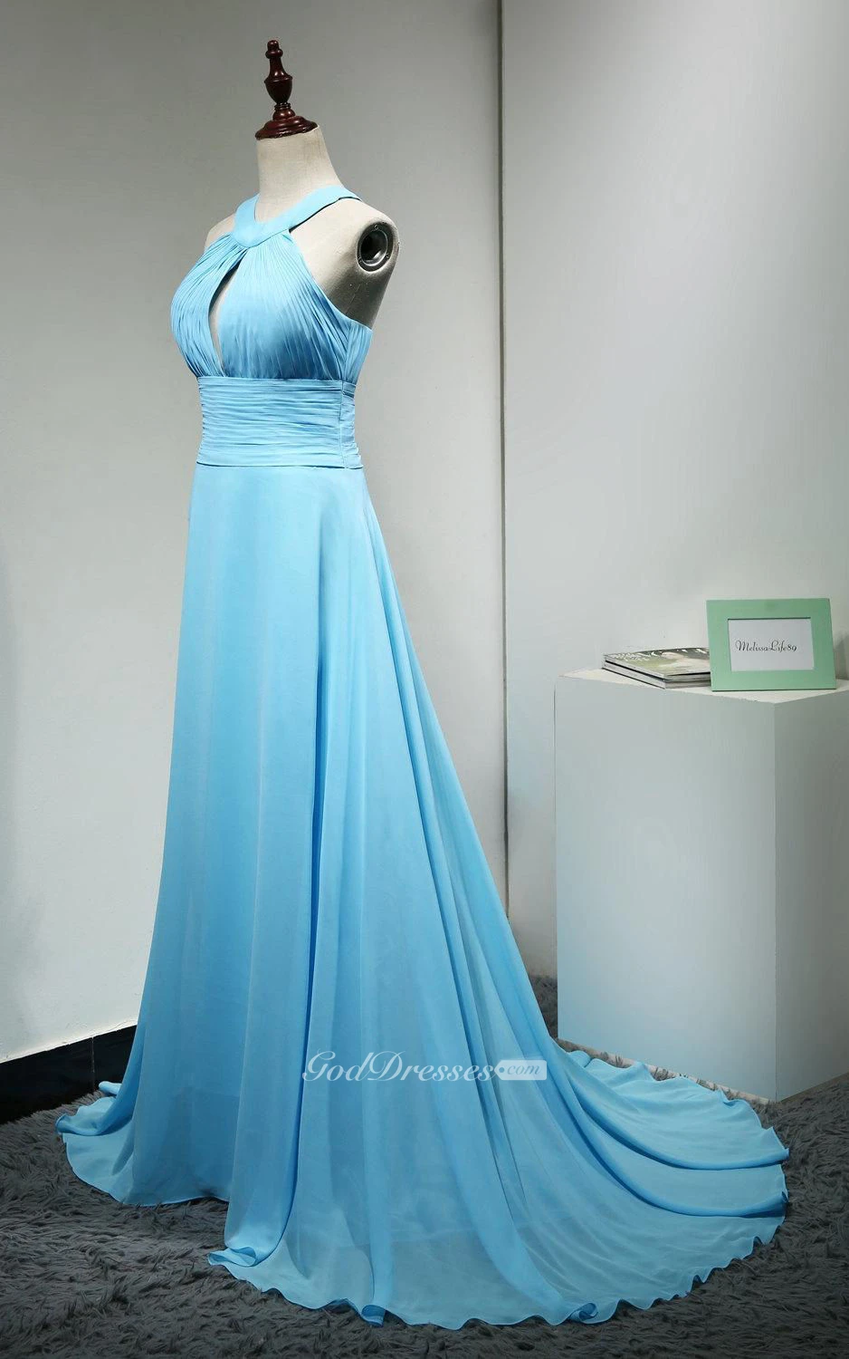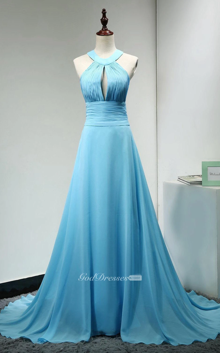 High Neck Front Keyhole A-line Chiffon Long Dress With Lace Up