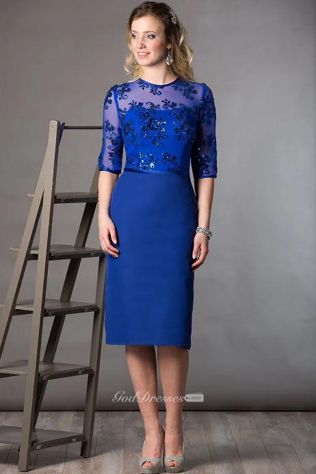 High Neck Half Sleeve Sheath Knee Length Mother Of The Bride Dress With Sequined Top