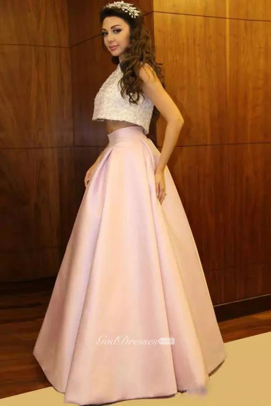 High Neck Jewel Two Piece Floor-length Sleeveless Satin Prom Dress with Zipper Back