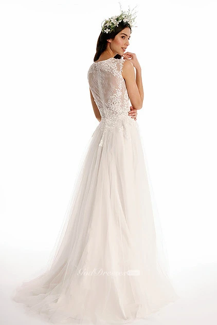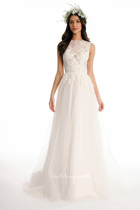 High Neck Long Appliqued Tulle Wedding Dress With Sweep Train And Illusion