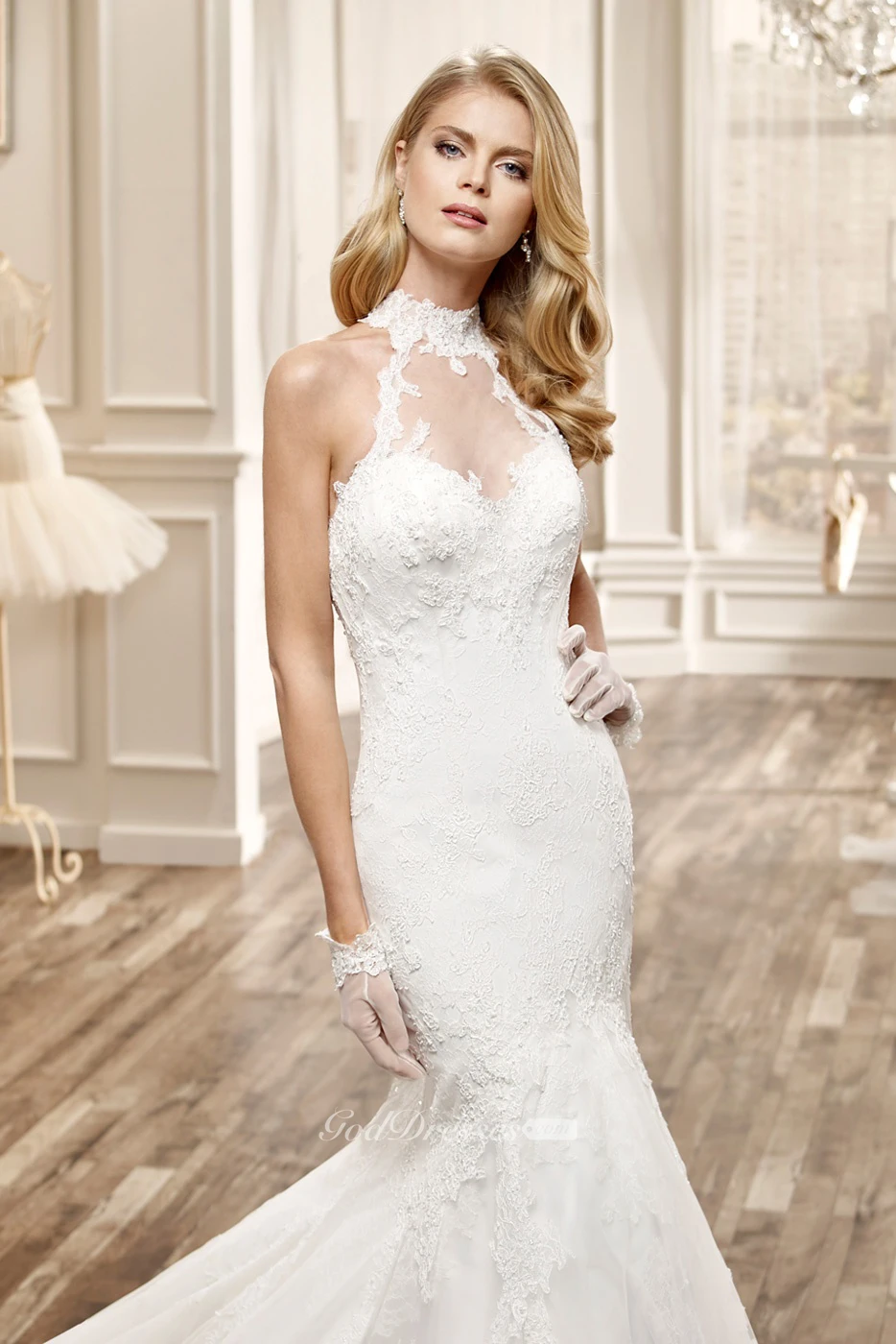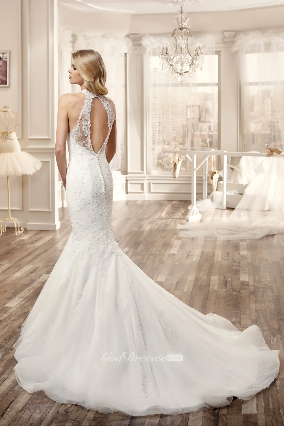 High-Neck Mermaid Lace Wedding Dress With Appliques And Keyhole Back