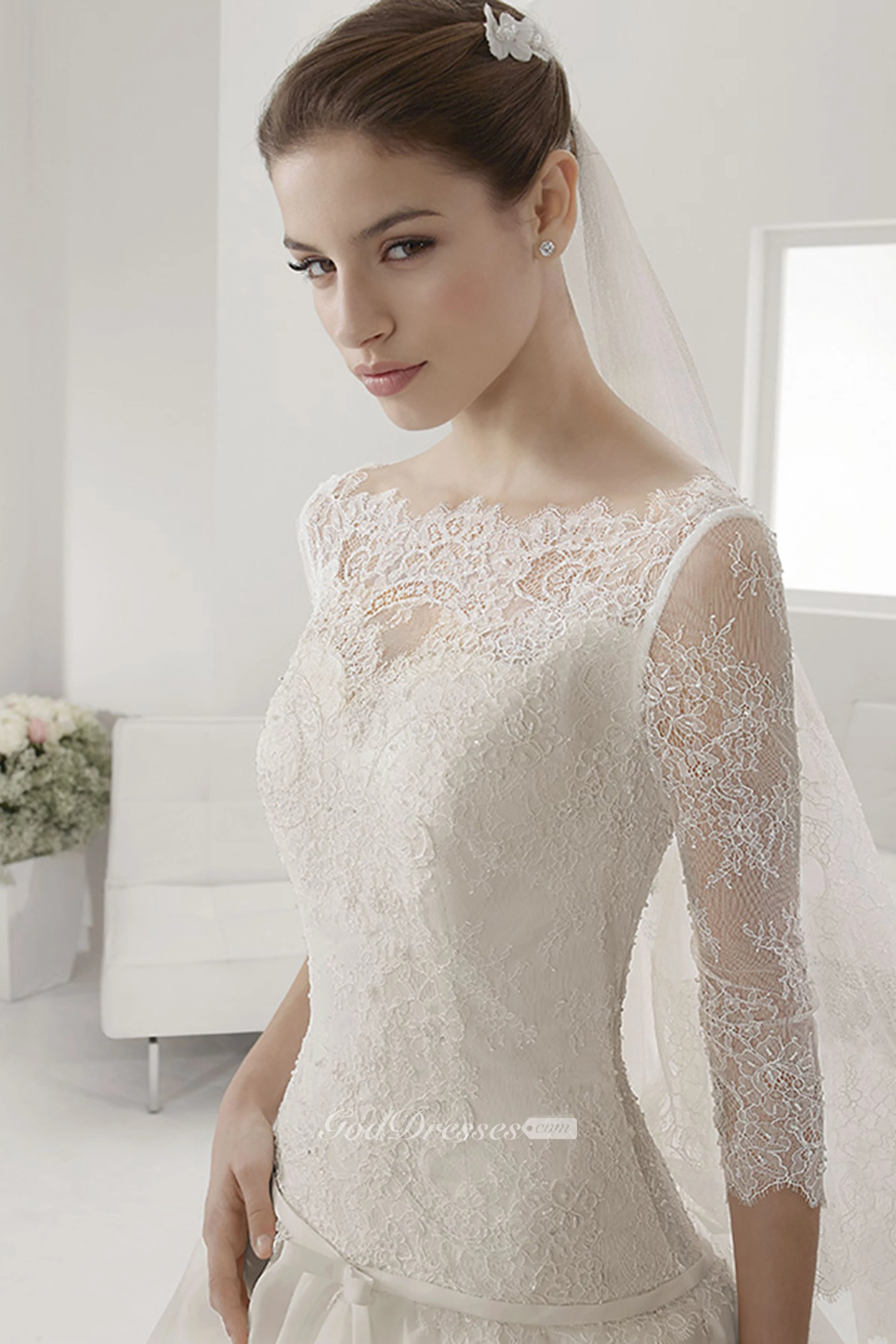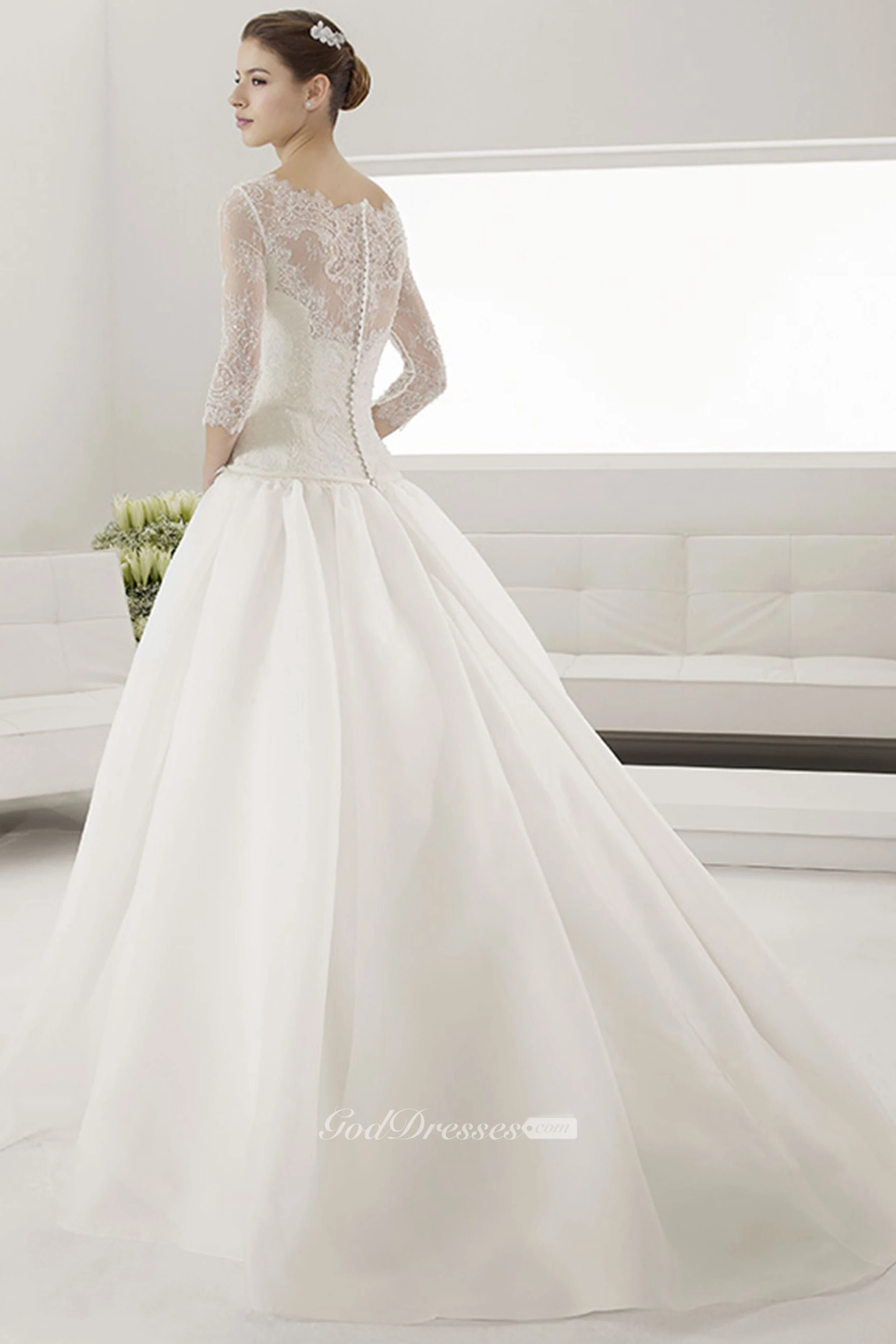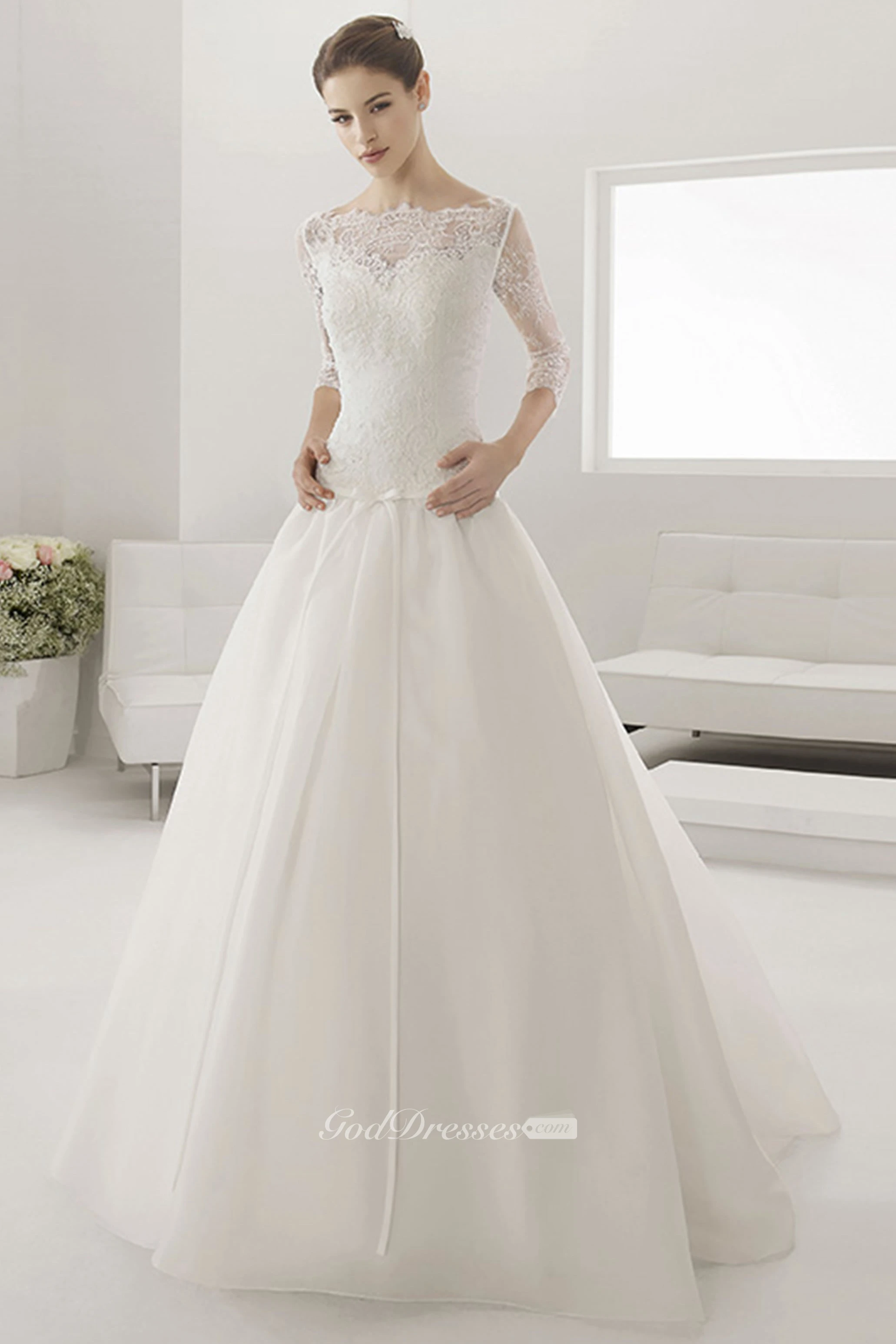 Illusion Bateau Drop Waist Ball Gown With Sash And 3-4 Sleeves