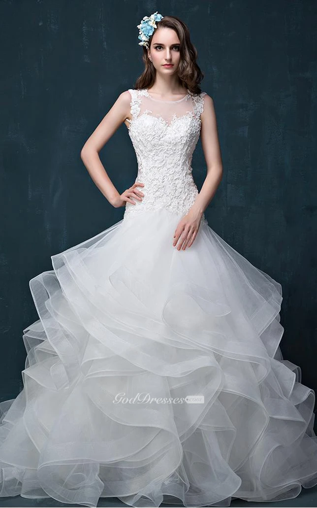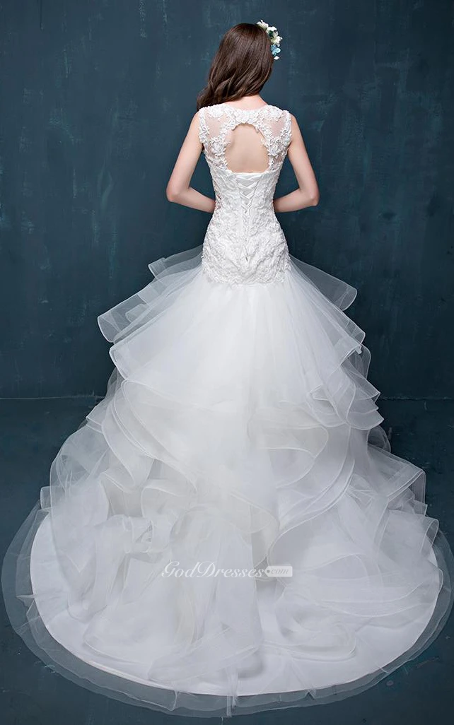 Illusion Beading Appliques Flower Ruffles Illusion Flower Illusion Lace-Up Back Keyhole Tulle Lace Organza Satin Dress