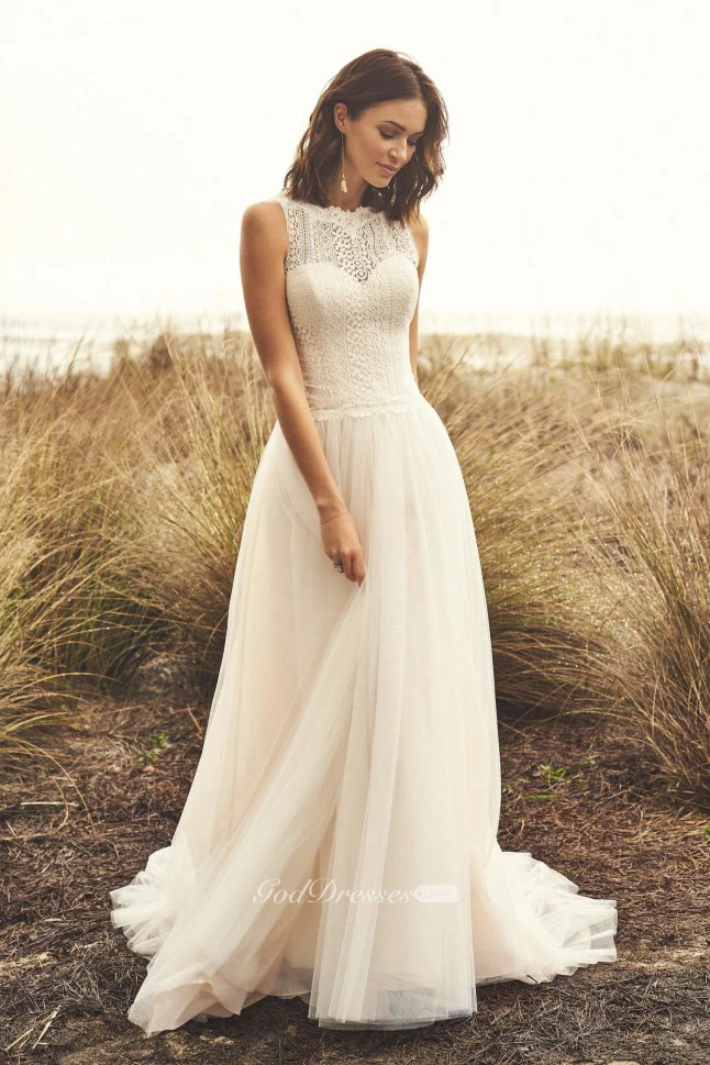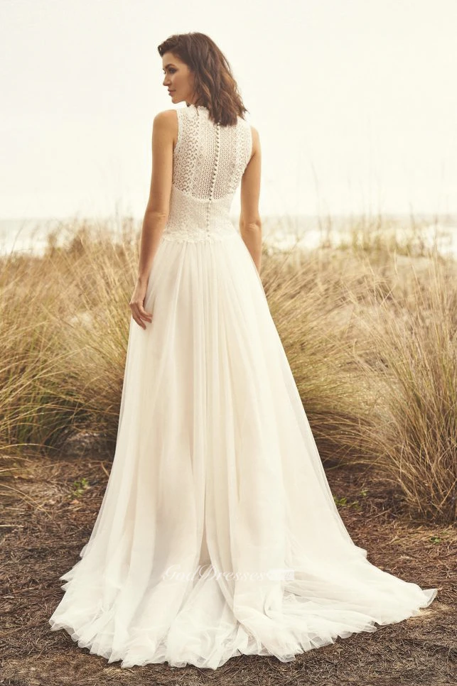 Illusion Button Back Sleeveless Jewel Neckline And Court Train Lace Tulle Wedding Dress