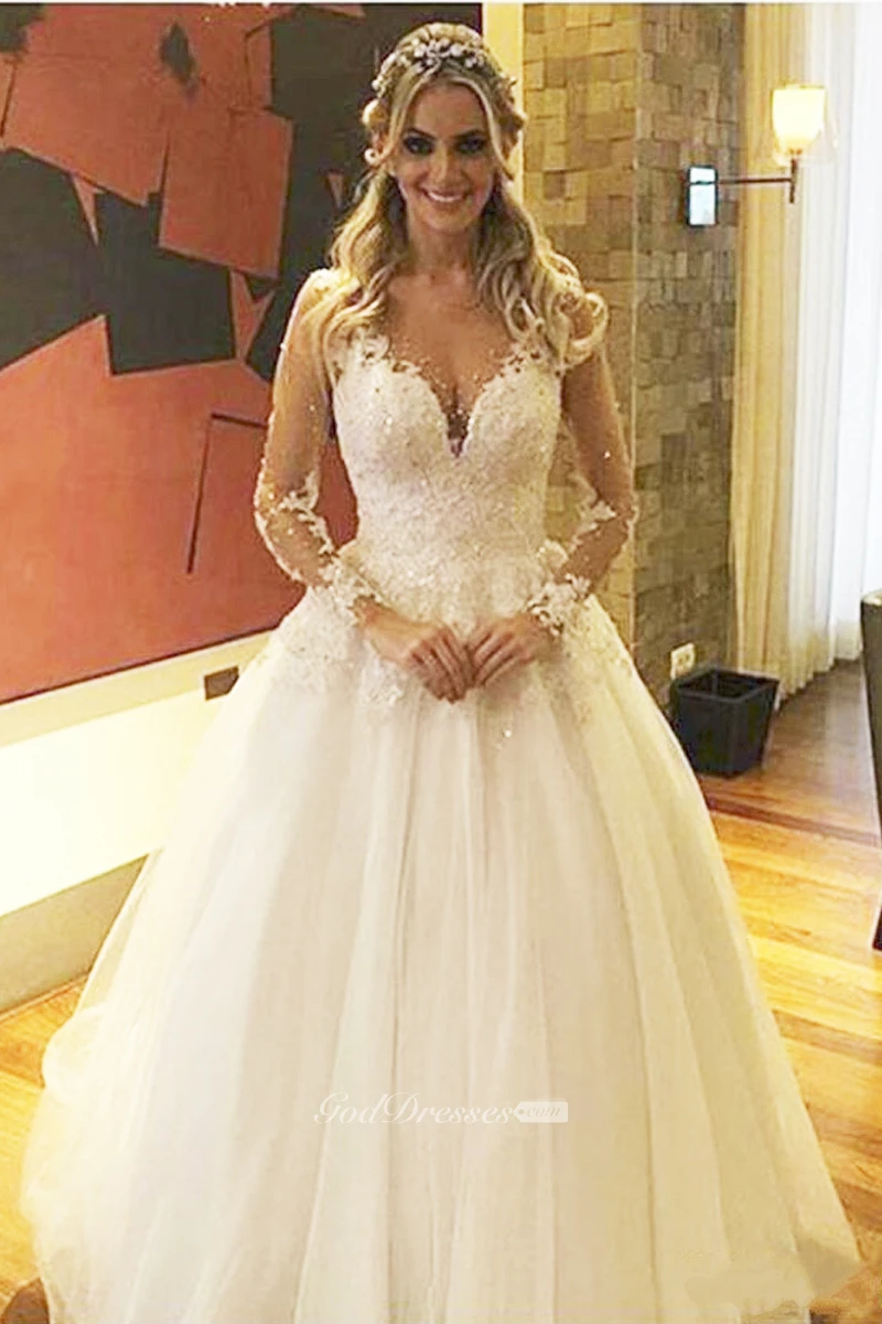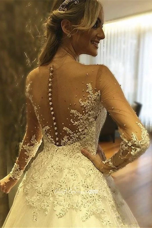 Illusion Deep V Neck Pearls Beaded Backless Sheer See Through Lace Wedding Dress