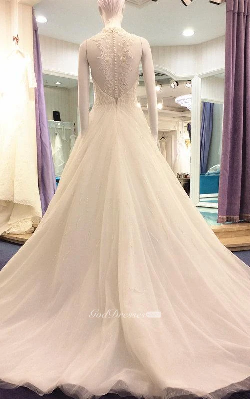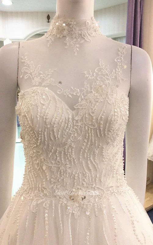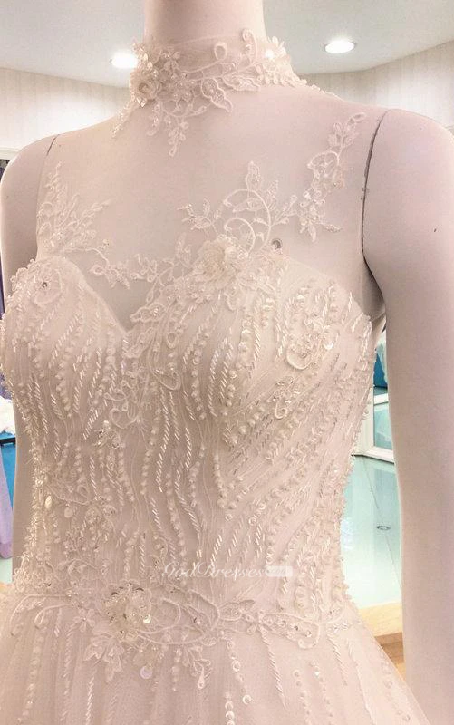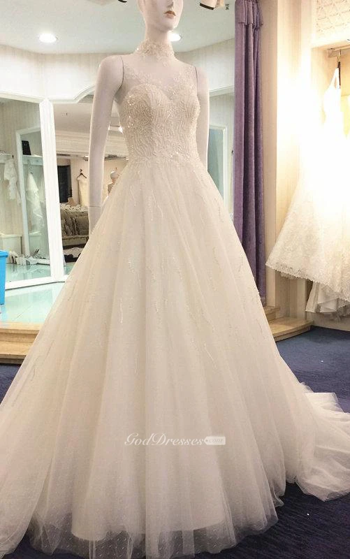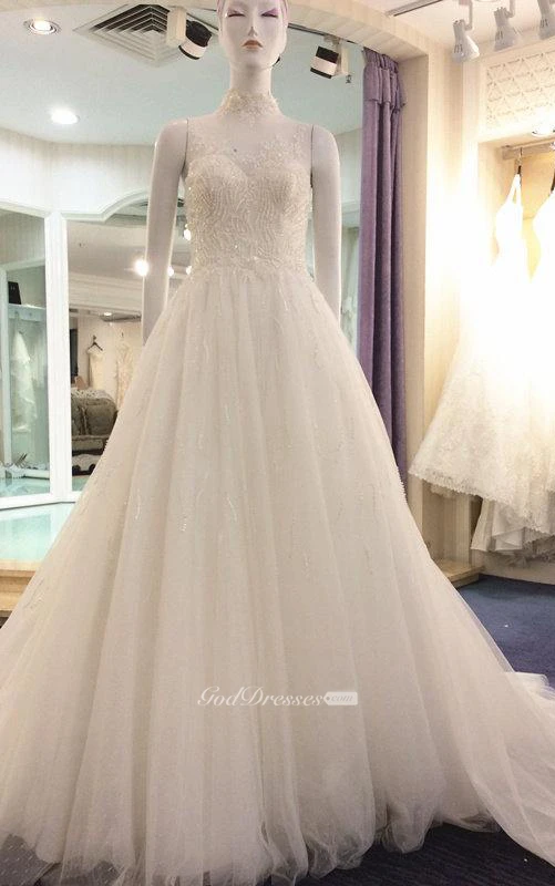 Illusion High Neck Sleeveless A-Line Tulle Dress With Beaded Bodice