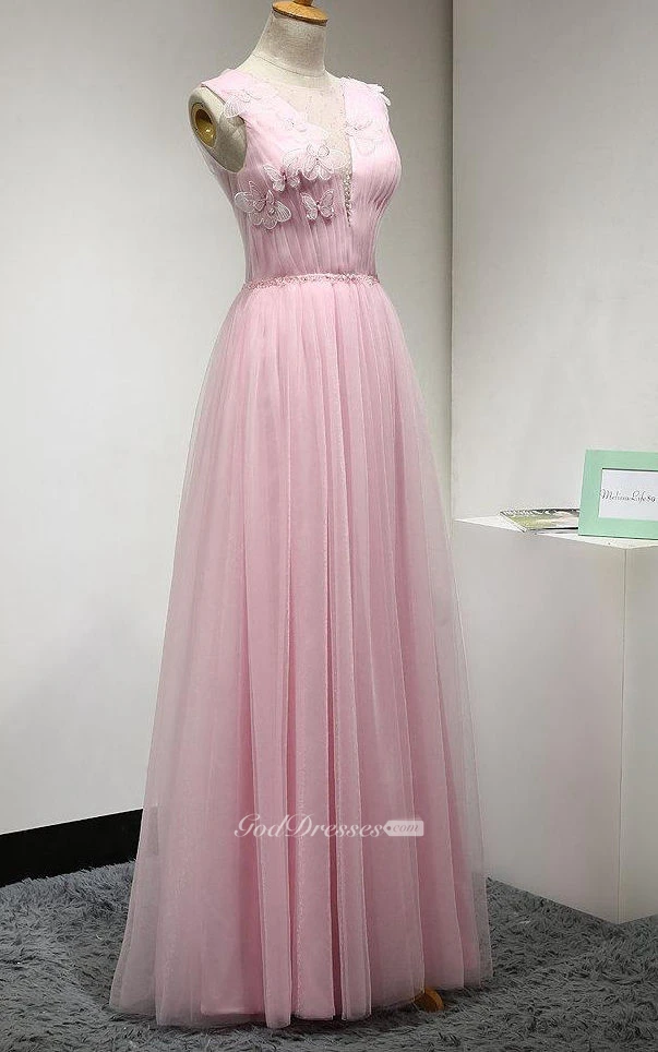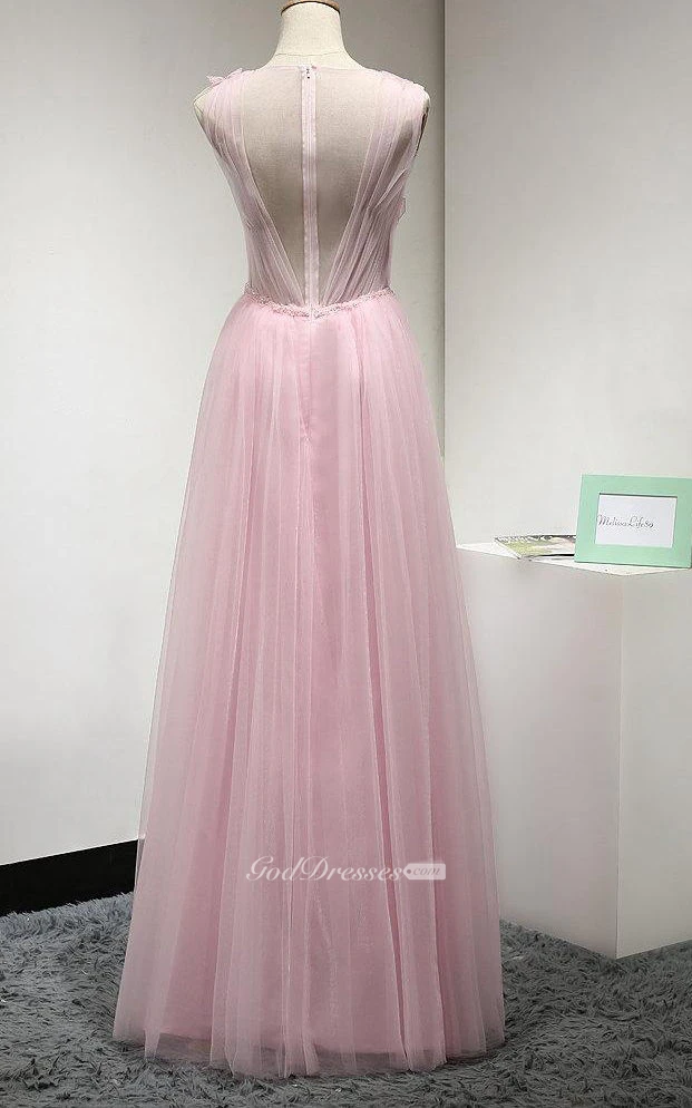 Illusion Jewel Neckline Pleated A-line Tulle Floor Length Dress With Flowers