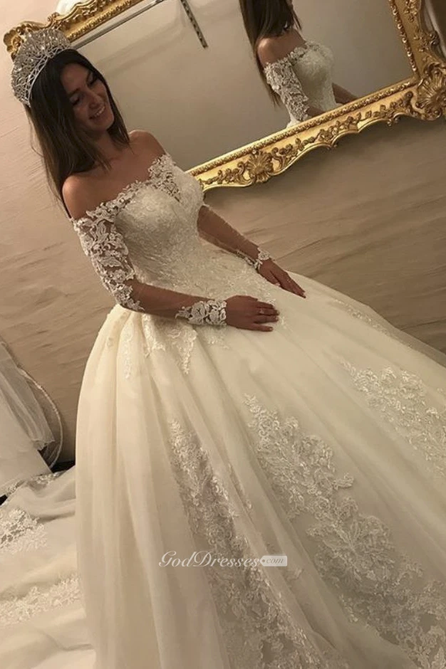 Illusion Lace Long Sleeve Luxury Off-the-shoulder Ballgown Wedding Dress With Keyhole Back