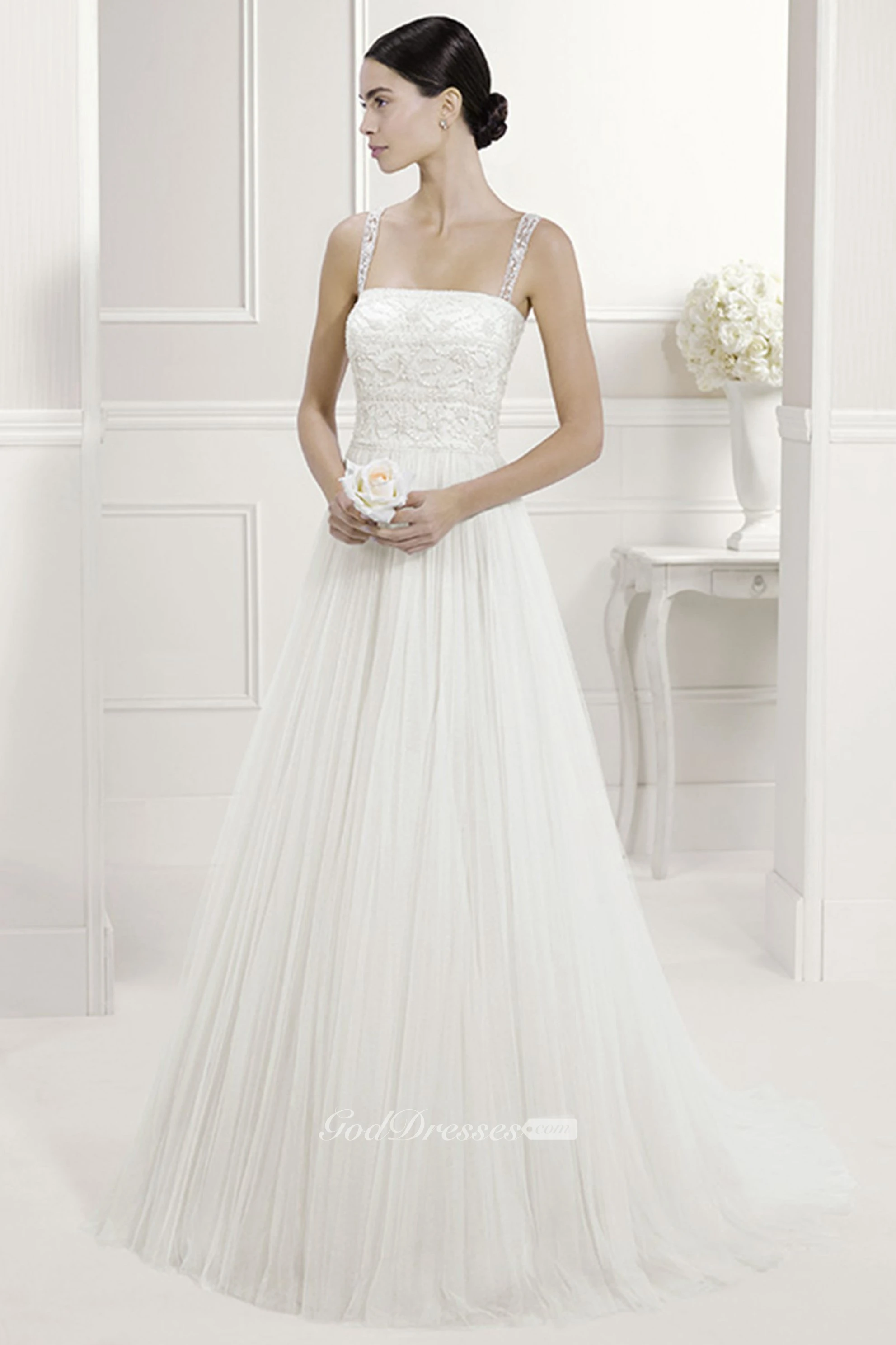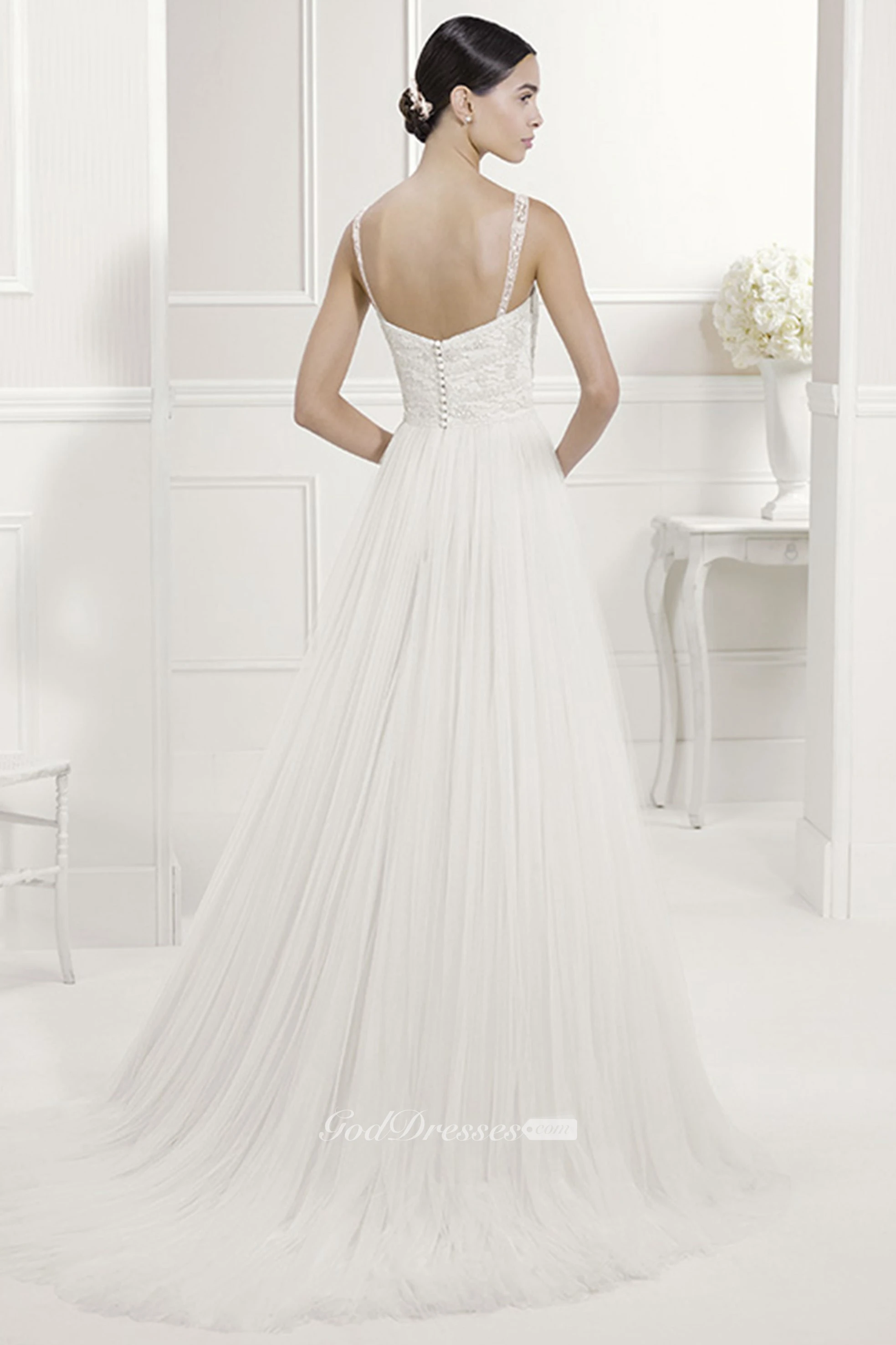 Illusion Lace Straps Square Neck A-Line Tulle Bridal Gown