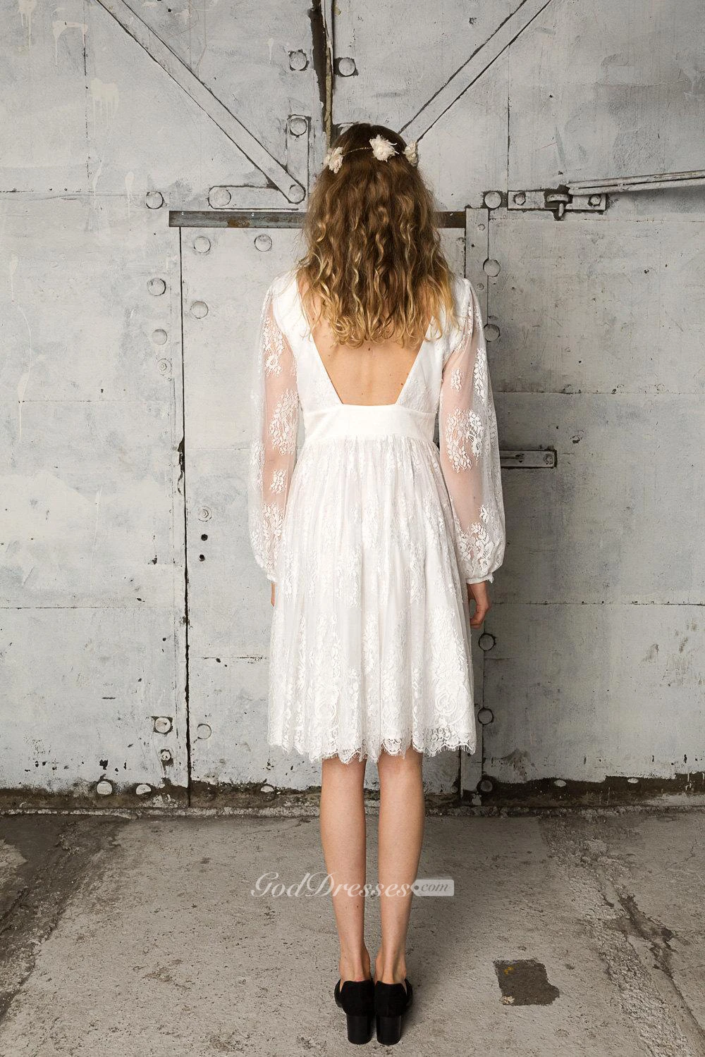 Illusion Long Sleeve V-Neck Knee Length Lace Dress With Open Back