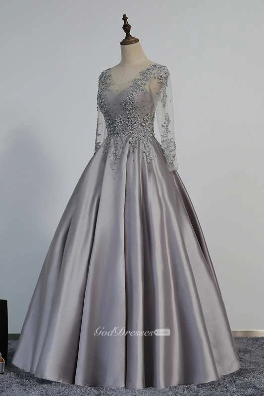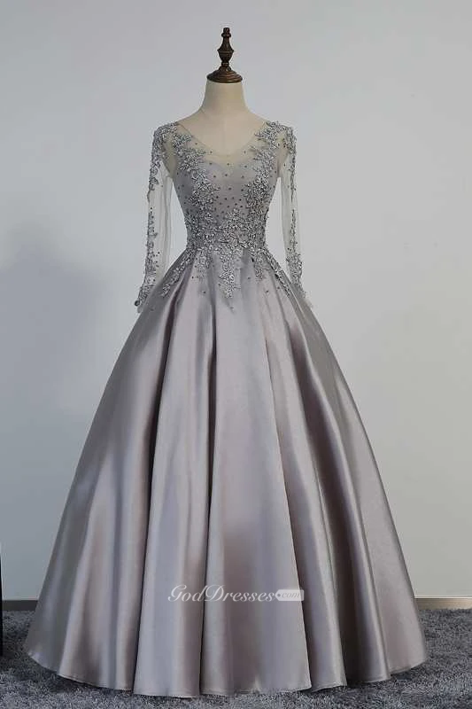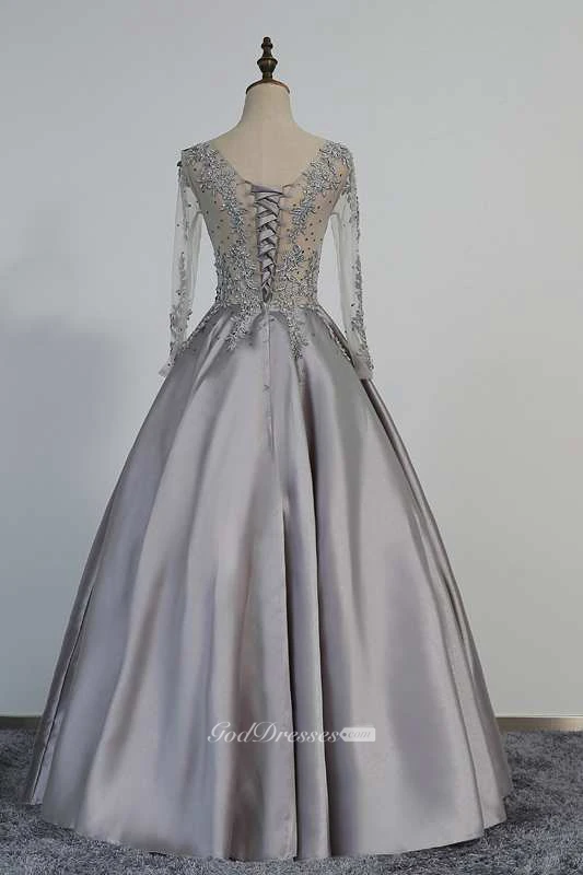 Illusion Long Sleeve V Neck Pleated Satin Ball Gown With Lace Detailing