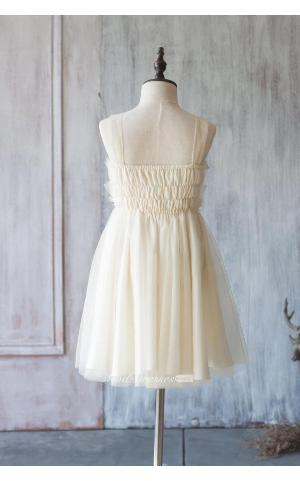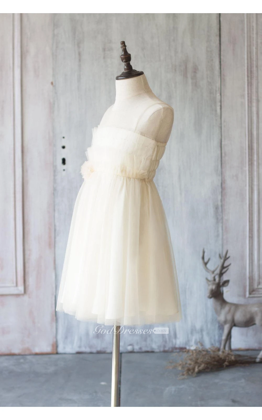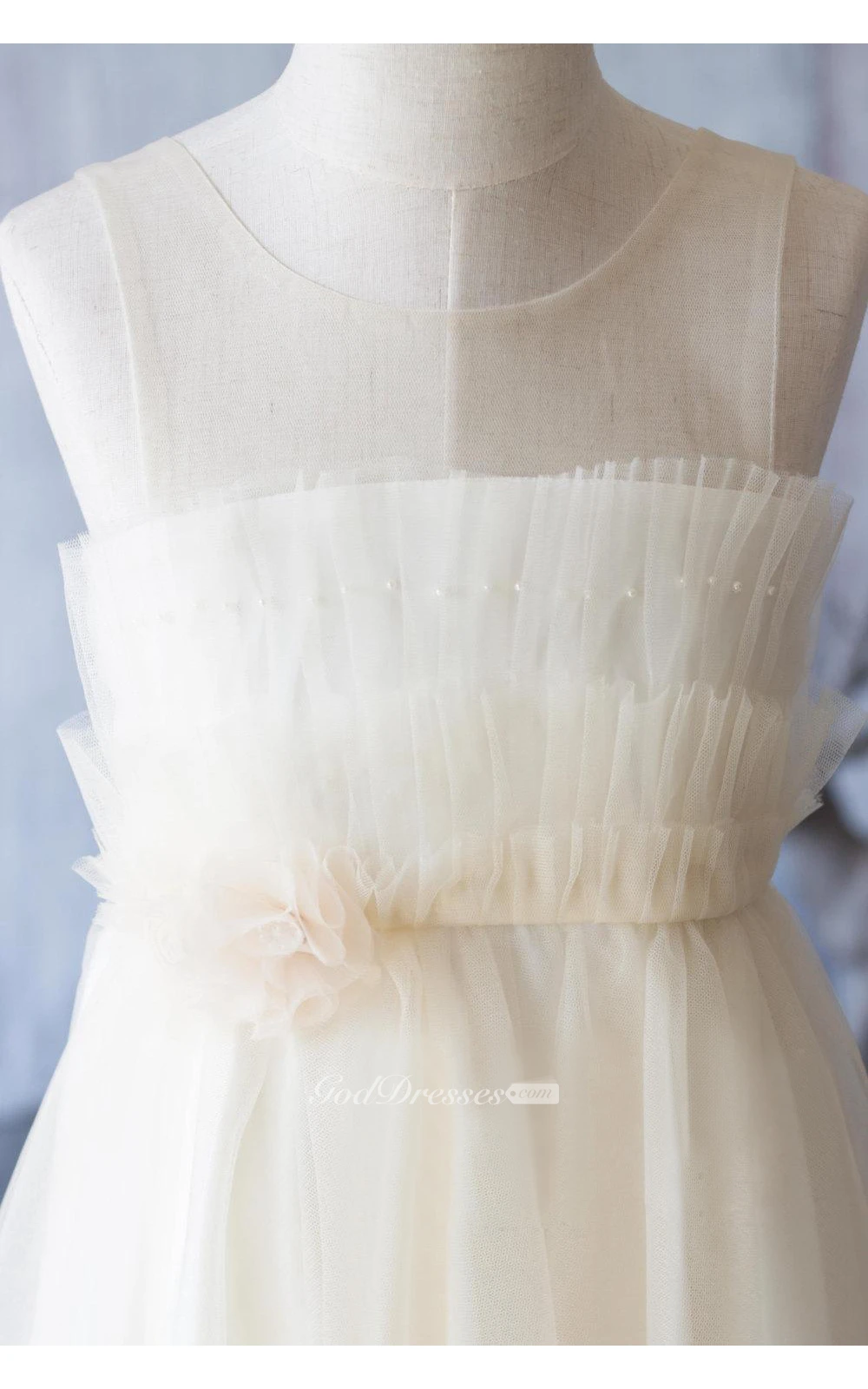 Illusion Neckline Sleeveless A-line Pleated Tulle Tea Length Dress With Flower