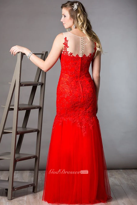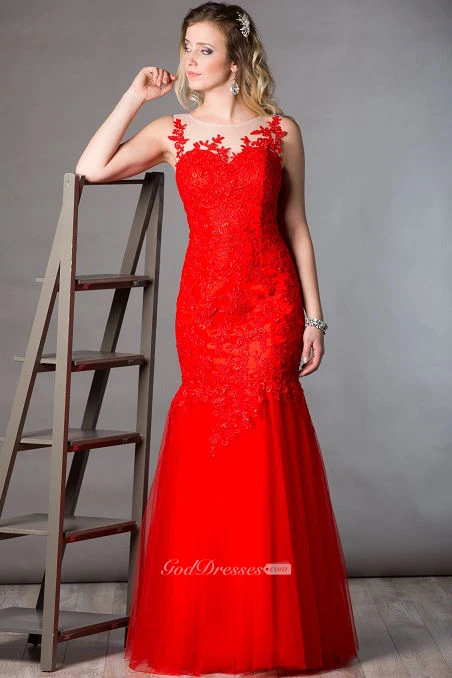 Illusion Neckline Sleeveless Mermaid Tulle Long Mother Of The Bride Dress With Appliqued Top