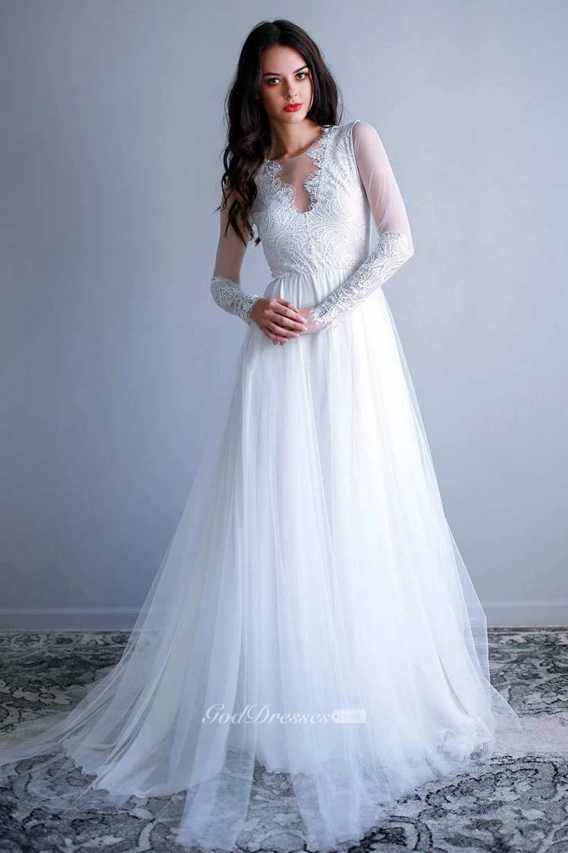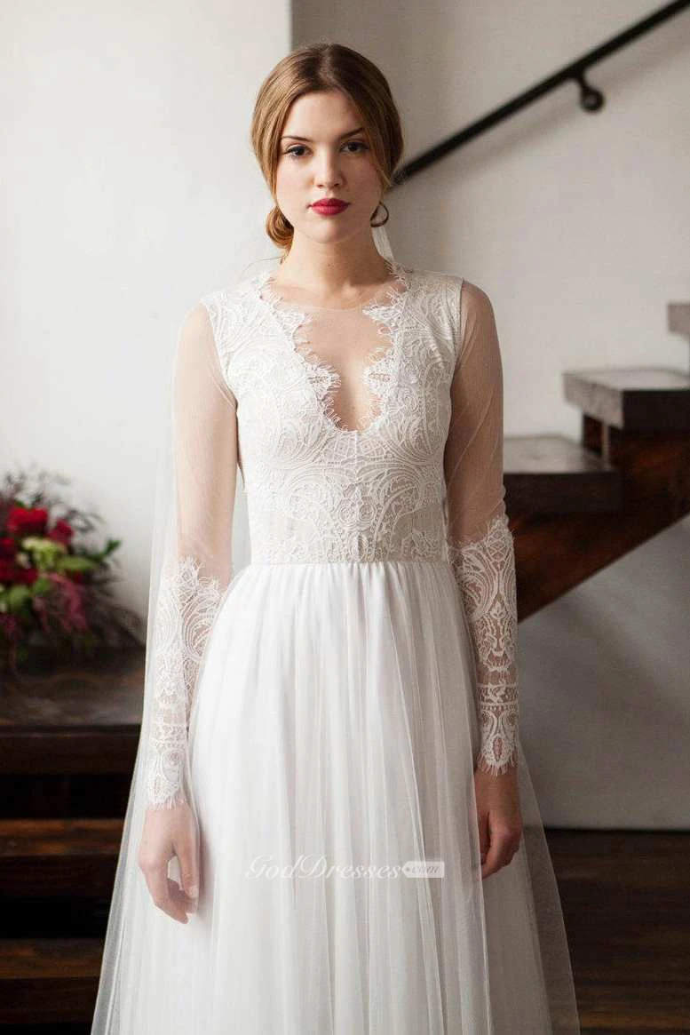 Illusion Scoop-Neck Long Sleeve Lace Tulle Wedding Dress With Pleats