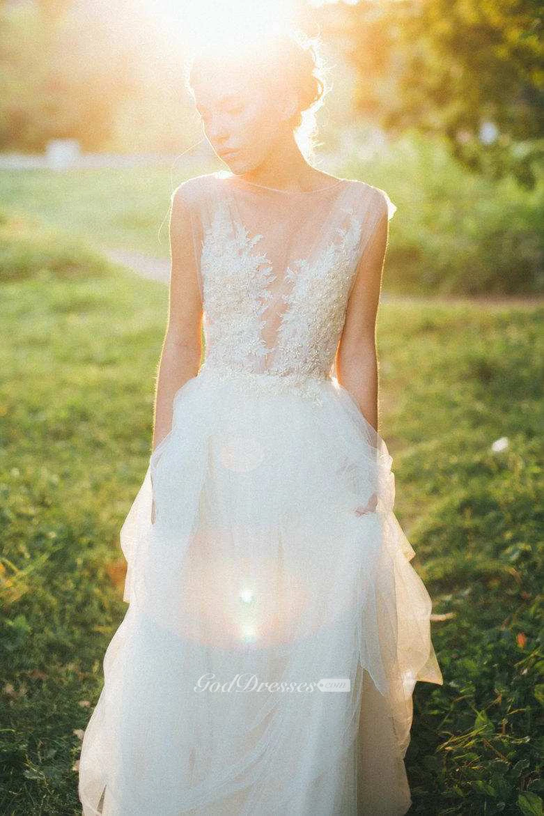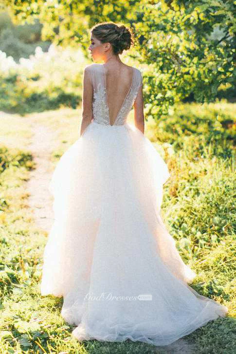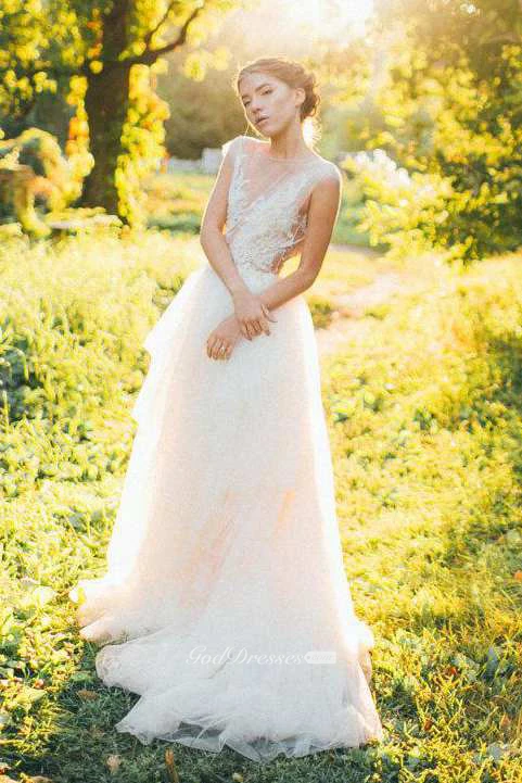 Illusion Scoop-Neck Sleeveless A-Line Tulle Wedding Dress With Appliques