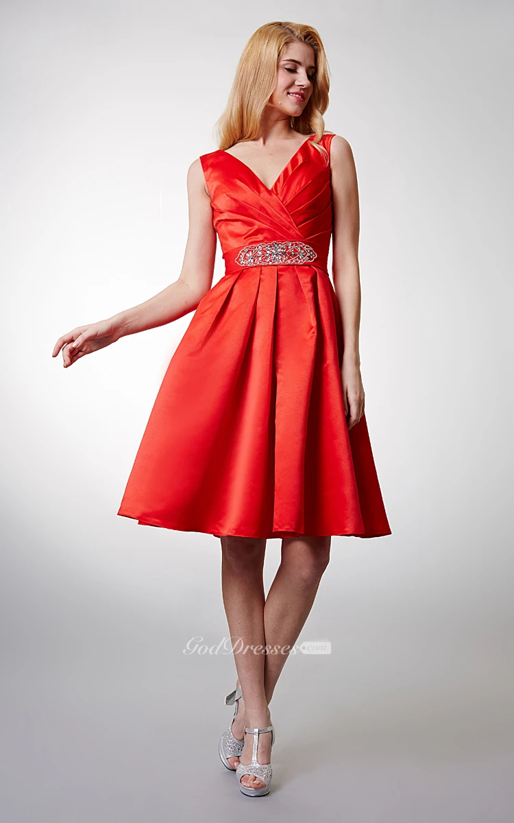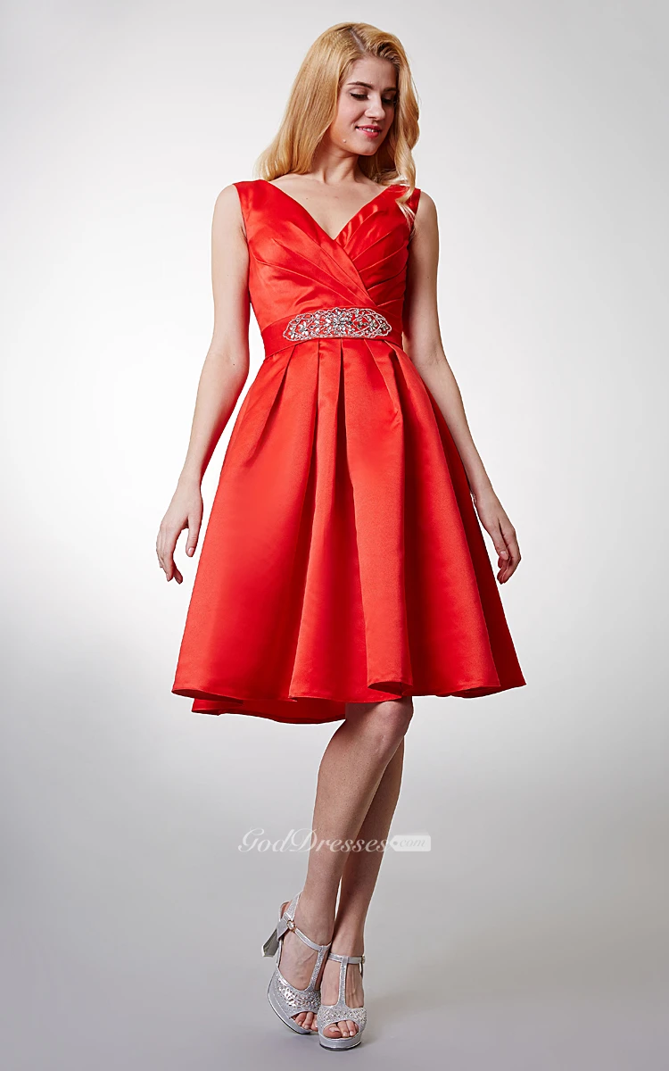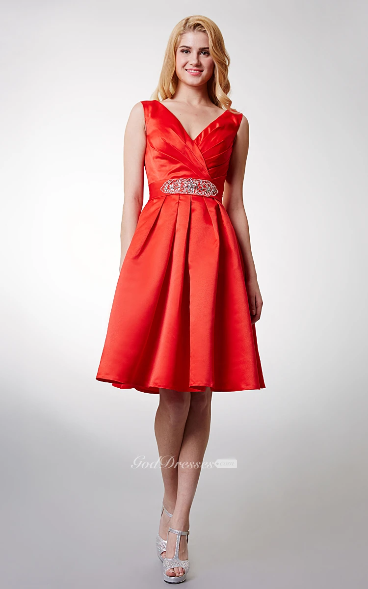 Impressive Sleeveless V-neck Short Satin Dress With Beaded Sash