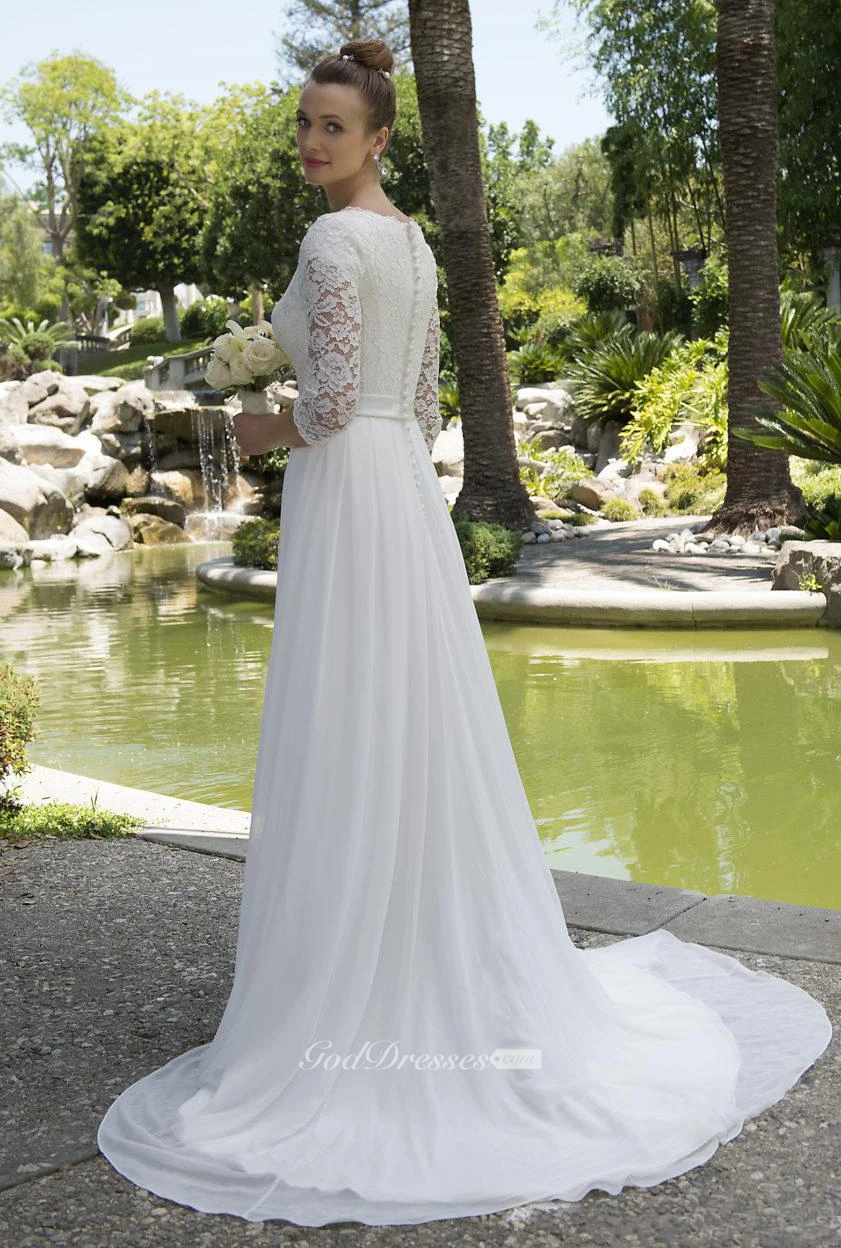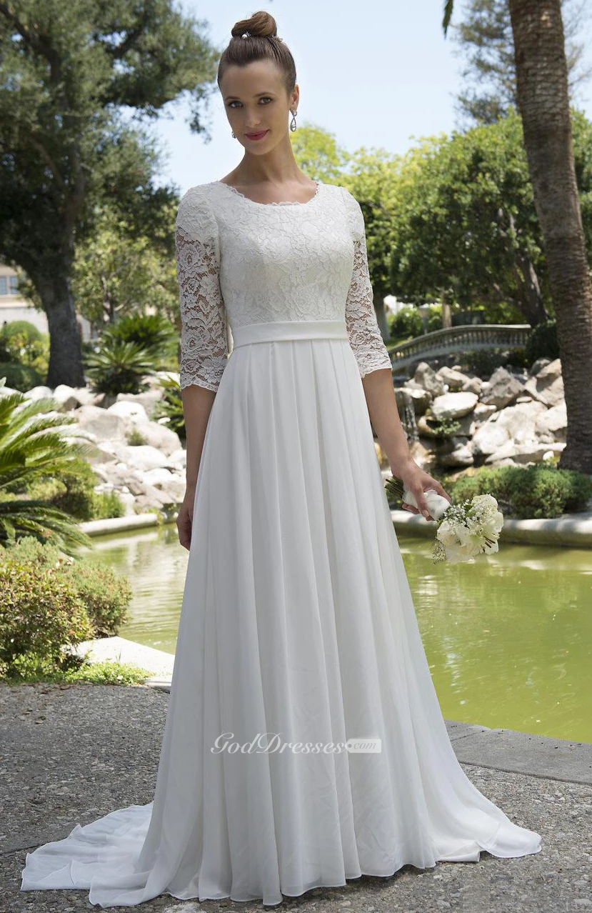 Informal Modest Beach Scoop Neck Lace Chiffon Wedding Dress With 3-4 Sleeves
