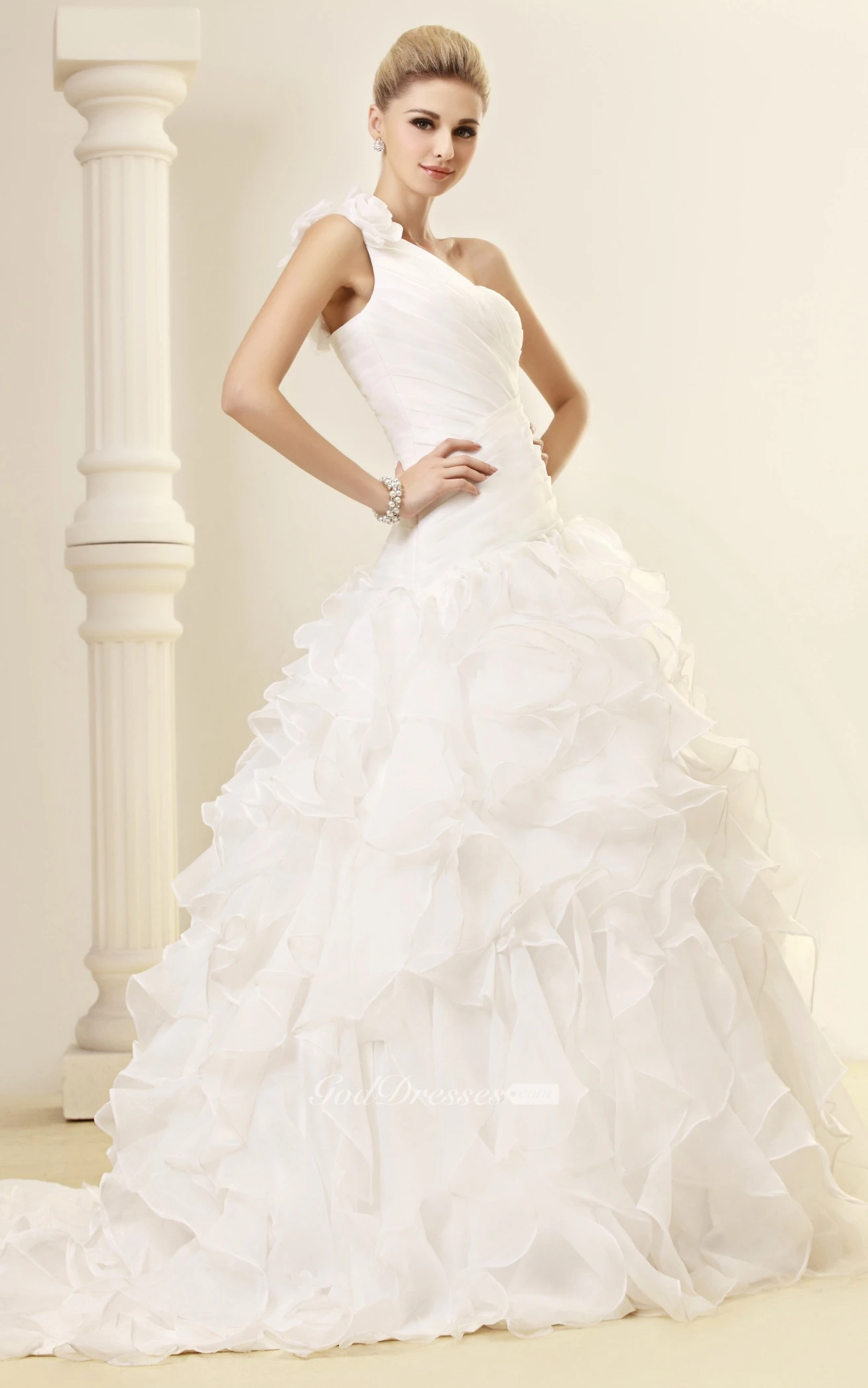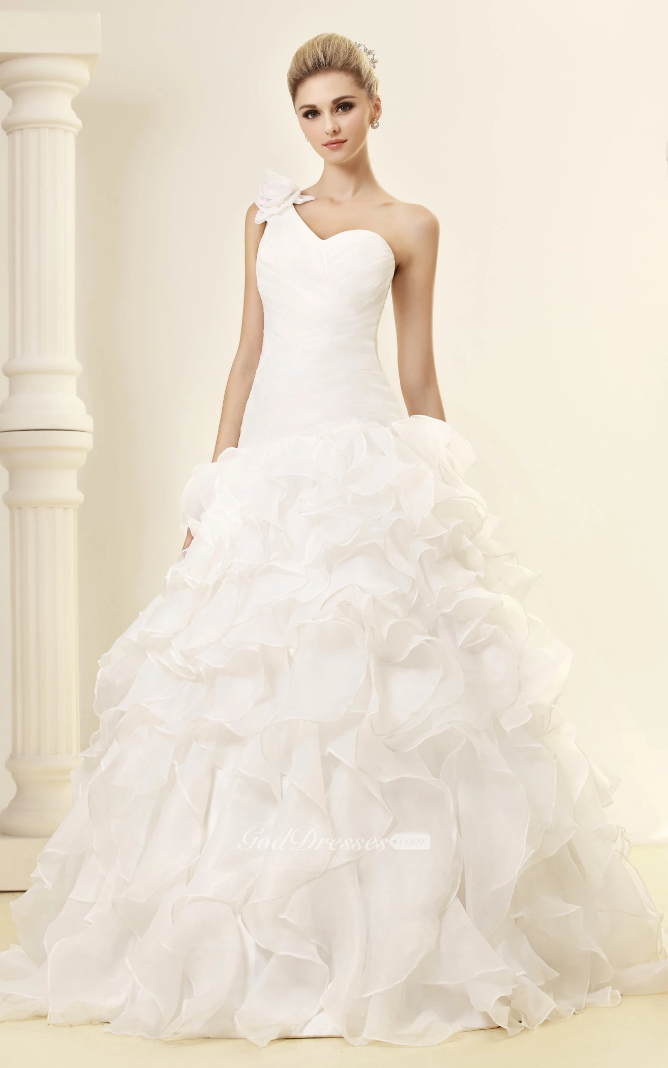 Intricate Ruched A-Line Gown With Single Strap and Ruffled Skirt