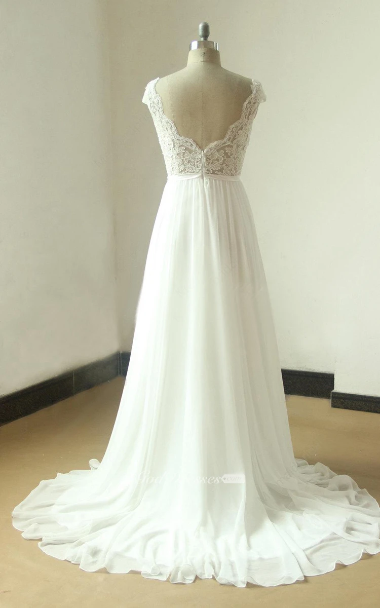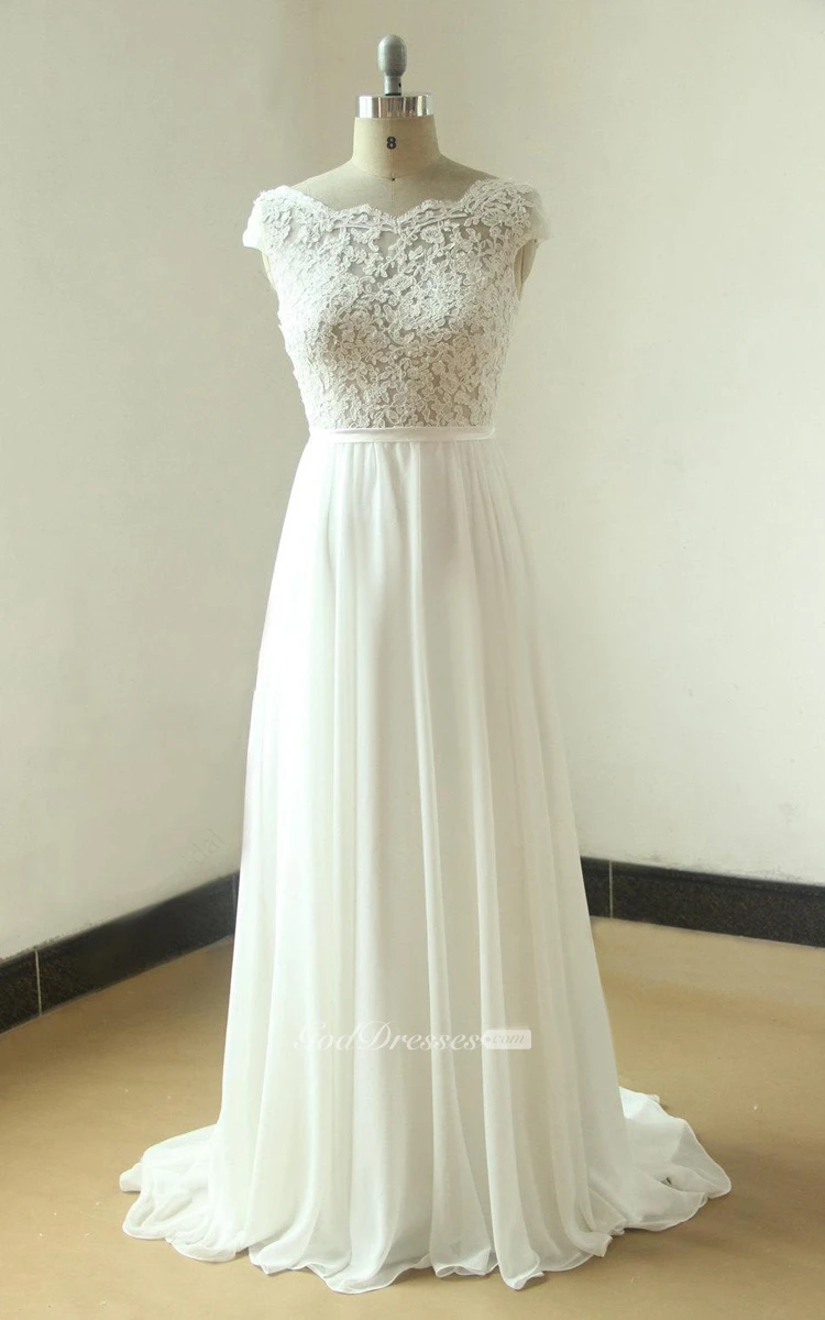Ivory A Line Chiffon Sheer Lace Wedding With Scallop Back Dress