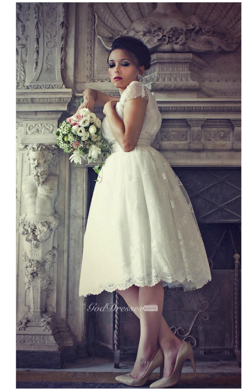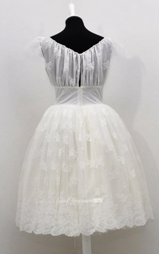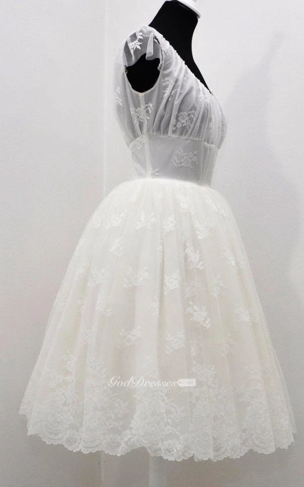 Jewel Empire Knee-Length Lace Wedding Dress With Ruching And Cap Sleeve