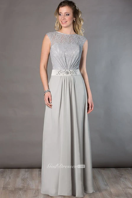 Jewel Neck Cap Sleeve Lace Top Chiffon Long Mother Of The Bride Dress With Crystal Waist