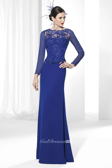 Jewel-Neck Floor-Length Appliqued Long-Sleeve Jersey Prom Dress