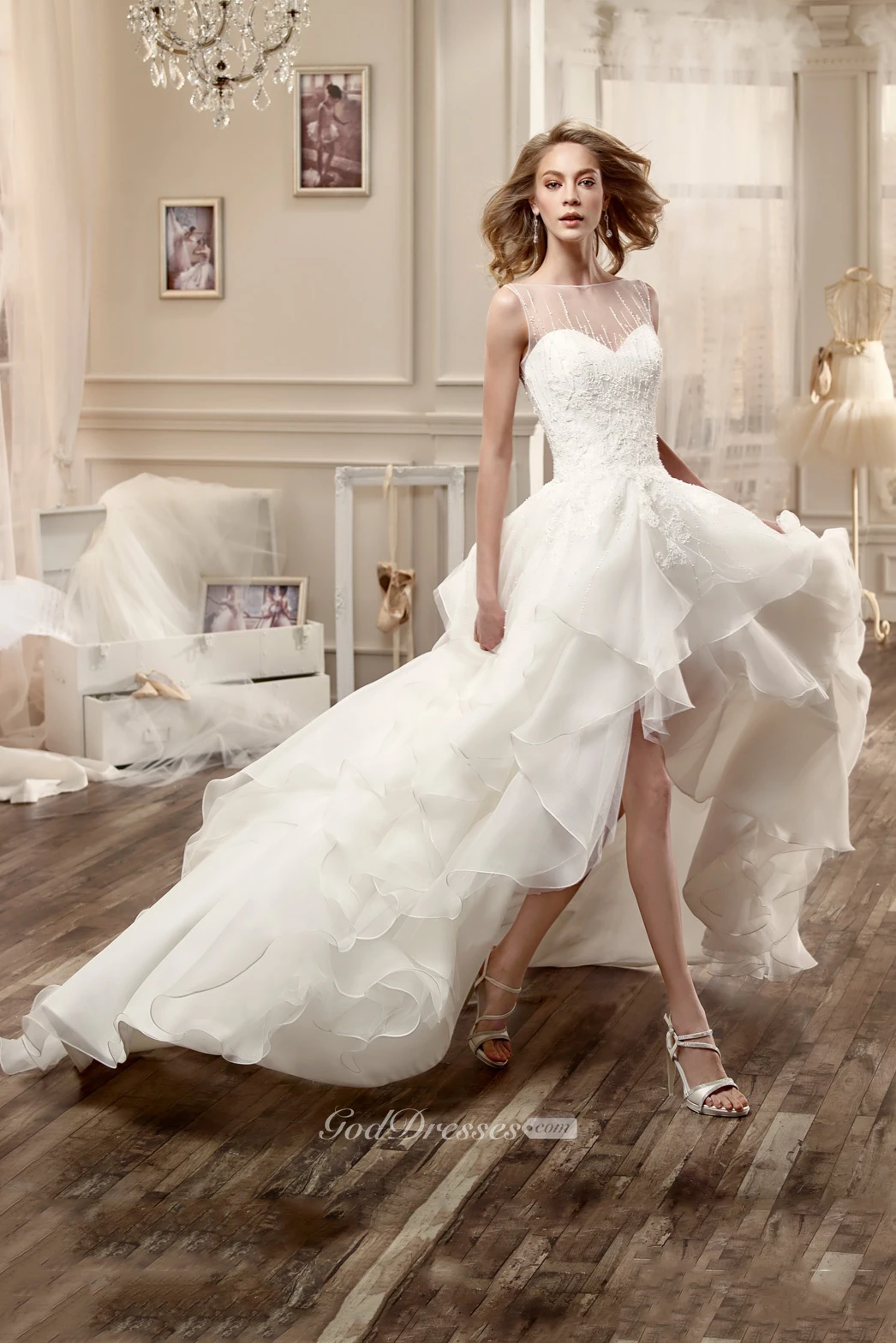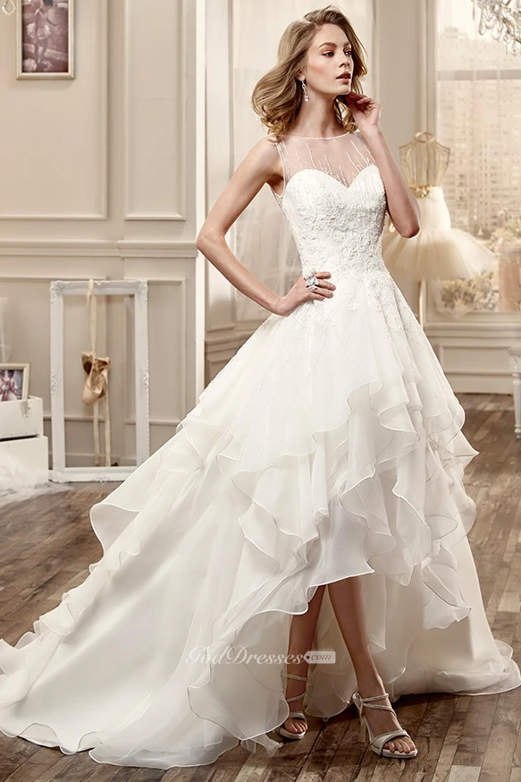 Jewel-Neck High-Low Wedding Dress With Cascading Ruffles And Beaded Bodice