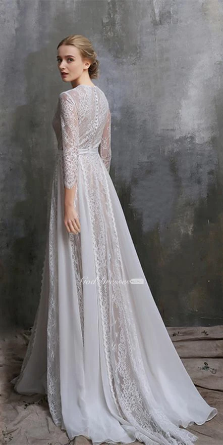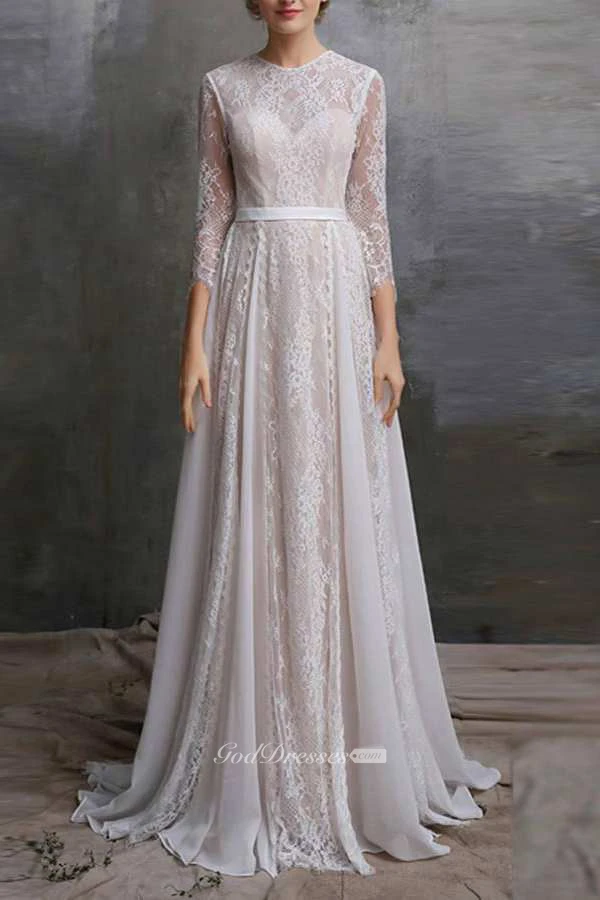 Jewel-Neck Lace Long Sleeve Pleated A-Line Wedding Dress
